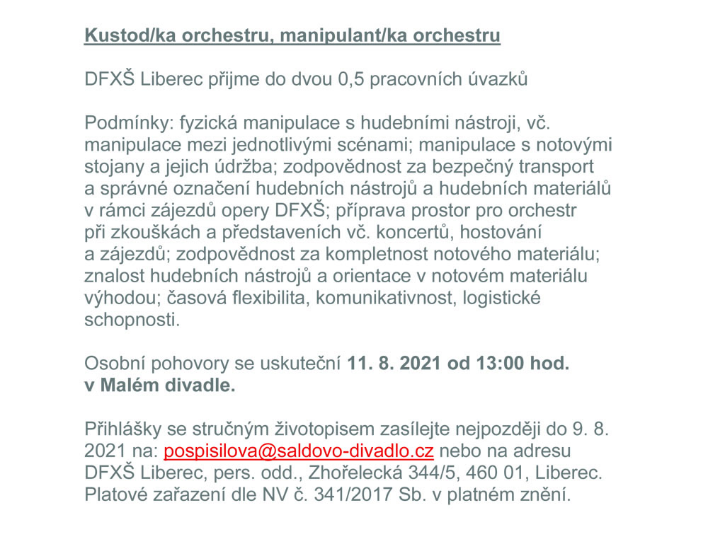Inzerce Divadlo F. X. Šaldy v Liberci hledá kustoda orchestru, manipulanta orchestru Publikováno 13/07/2021 sdílejte: 0 minut čtení sdílejte: TémataSeznam inzerátů Sdílet článek Facebook email zkopíruj odkaz vytisknout sdílejte: Předchozí článek Teprve 70 let uplynulo od úmrtí jednoho z nejvlivnějších skladatelů 20. století Další článek Týden s tancem 0 0 hlasy Ohodnoťte článek Odebírat Přihlášení Upozornit na nové a další komentáře nové odpovědi na můj komentář Label {} [+] Jméno* E-mail* Webová stránka Label {} [+] Jméno* E-mail* Webová stránka 0 Komentáře Nejstarší Nejnovější Most Voted Inline Feedbacks Zobrazit všechny komentáře Načíst další