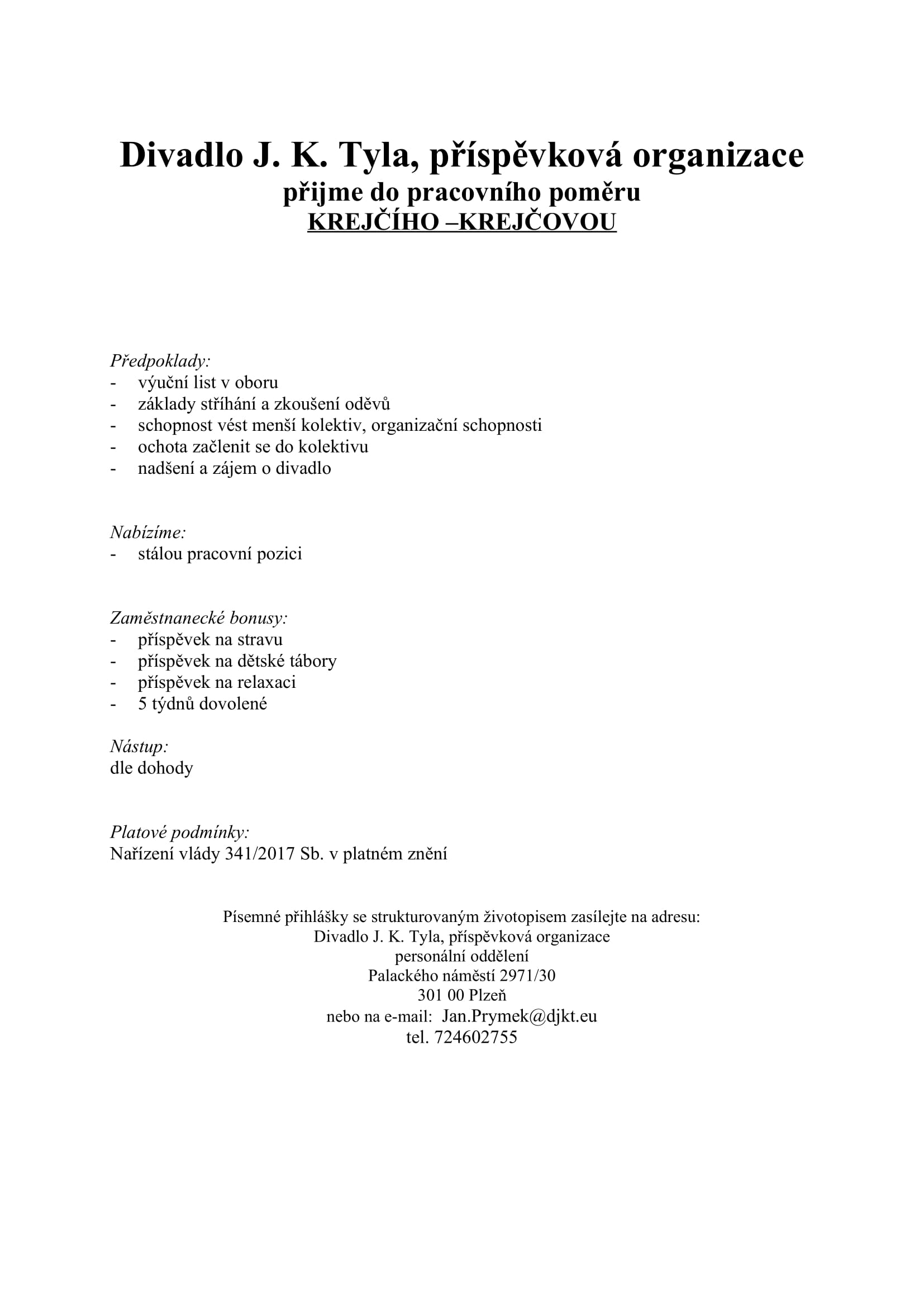 Inzerce Divadlo J. K. Tyla v Plzni přijme do pracovního poměru krejčovou Publikováno 19/08/2022 sdílejte: 0 minut čtení sdílejte: TémataSeznam inzerátů Sdílet článek Facebook email zkopíruj odkaz vytisknout sdílejte: Předchozí článek Hudební Kroměříž zakončí duet Kněžíkové a Plachetky Další článek Olomoucký varhanní festival slaví 200. výročí narození velikána varhanní hudby Césara Francka 0 0 hlasy Ohodnoťte článek Odebírat Přihlášení Upozornit na nové a další komentáře nové odpovědi na můj komentář Label {} [+] Jméno* E-mail* Webová stránka Label {} [+] Jméno* E-mail* Webová stránka 0 Komentáře Nejstarší Nejnovější Most Voted Inline Feedbacks Zobrazit všechny komentáře Načíst další