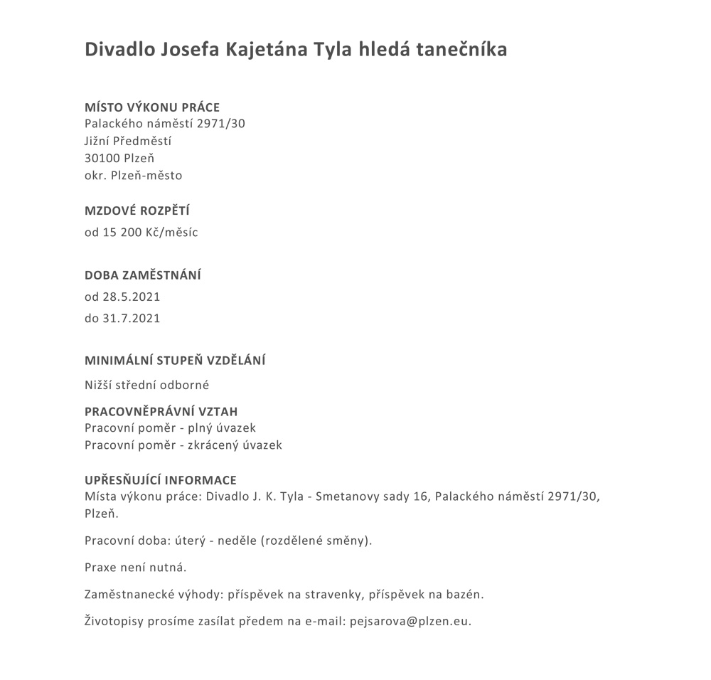 Divadlo Josefa Kajetána Tyla hledá tanečníka