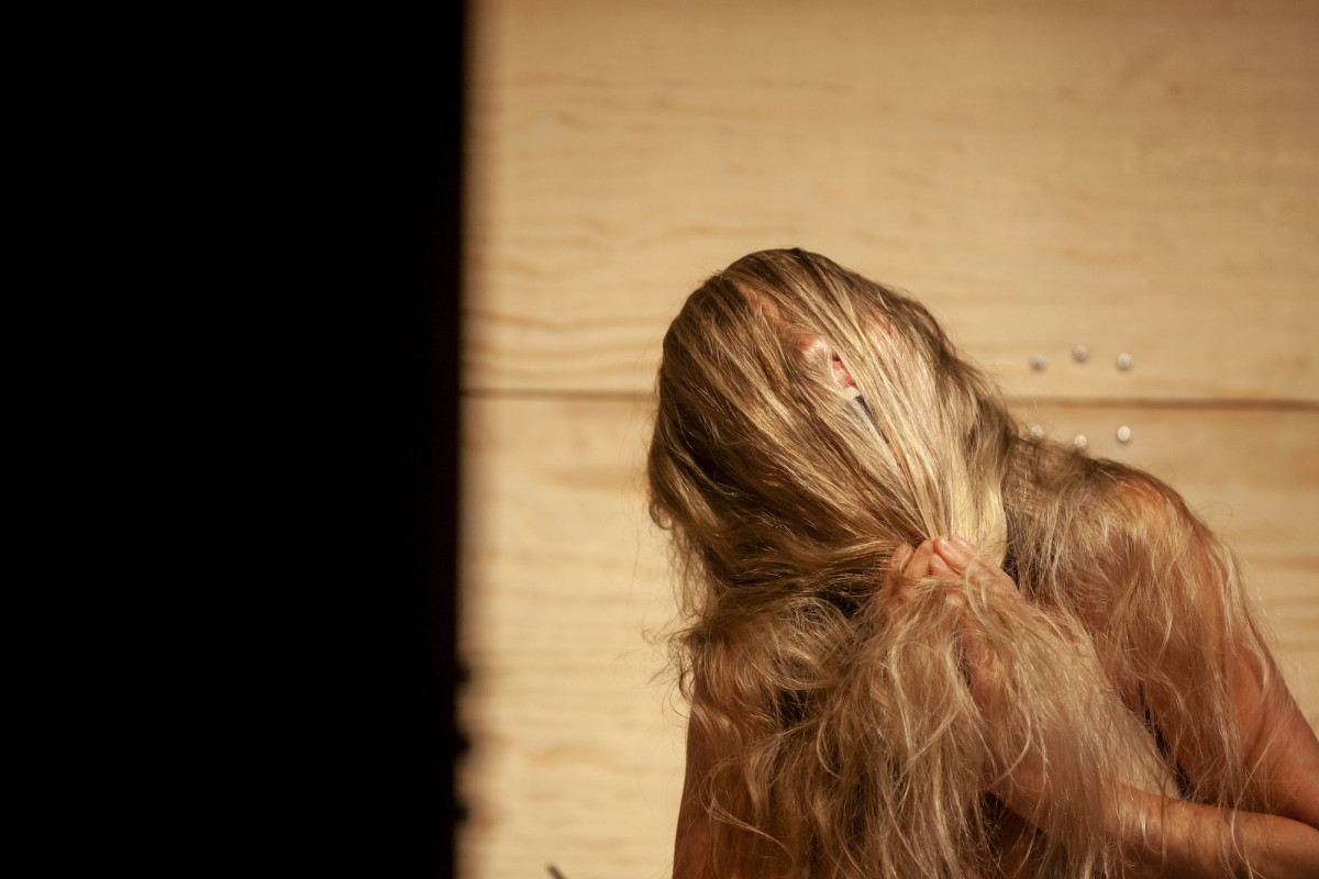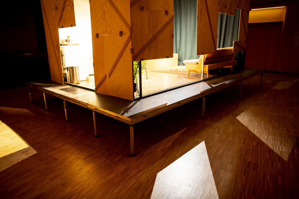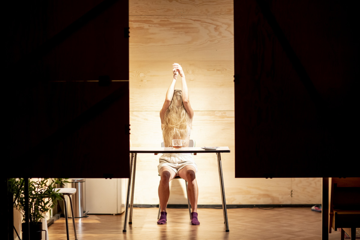 Buďme chvíli pragmatičtí a pohleďme na výsledek a jeho účinnost. Scénografické řešení je skvělé, má nápad a zahrnuje celou sémiotickou triádu znaku. Představení se neodehrává na jevišti, ale ve volném prostoru vyklizeného sálu, jemuž vévodí velká dřevěná konstrukce, v níž se za soustavou desek evidentně ukrývá hlavní postava – v bezpečí, ale také ve vězení. Jako v domečku pro panenky, ale tady uvnitř je balerína ne na klíček, ale živá. Jde nejen o scénografickou stavbu samotnou, okolo níž je možné nesměle obcházet, ikonické zobrazení úkrytu, ale také indikuje stav uzavřenosti, kterou je třeba obousměrně překonat, a navíc symbolizuje síly, které člověka a člověk sám sebe uzavírá. Jak bude jevištní výpověď pokračovat, budou z této stavby postupně jako pláty ledu mizet jednotlivé díly, až před námi zůstane umělkyně sama sebou a bez ochrany před světem. Je to ale proces, kterým je nutné projít postupně – od prvního náznaku, kdy jediným otvorem spatříme jen její dosud vypracované nohy v první pozici.