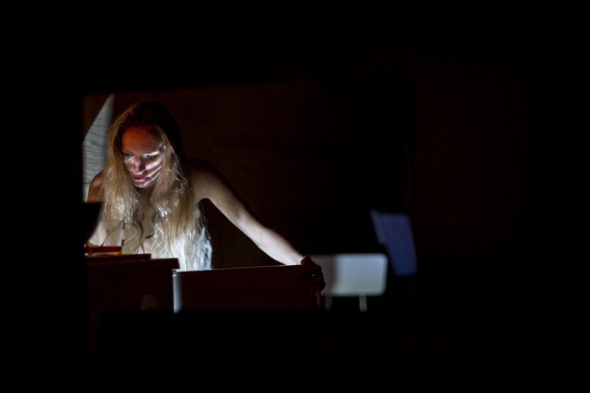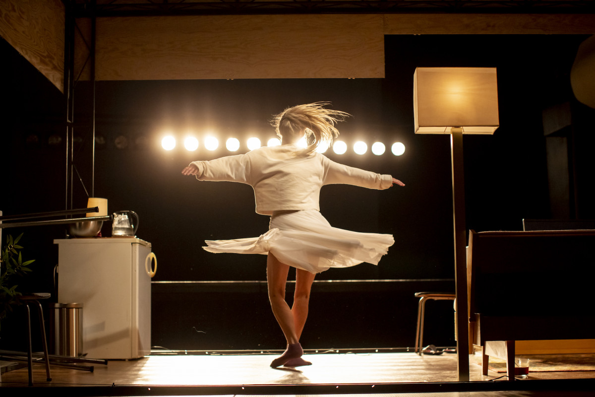 Zpět k „Invisible Báře“. Proces odhalování je estetický i provokující, nutí diváky k jisté součinnosti, ke změně úhlu pohledu a k vlastnímu pohybu prostorem divadla, ačkoli myslím, že toho publikum zatím příliš nevyužívá, protože tohle nahlížení do cizího intimního prostoru vyvolává v člověku i pocit nepatřičnosti. Uvolnění roste logicky s tím, jak zábran ubývá a „pokojíček pro baletky“ se otevírá ze všech stran. Barbora Kaufmannová nemluví, ale ze záznamu slyšíme od začátku její výpovědi natočené v rozhovorech s režisérkou i dramaturgyní. Prostřednictvím tohoto autentického příběhu se divák dostává hlouběji pod slupky umělecké osobnosti k živoucí ženě, která má odvahu k odhalení svého nitra. Její hlas je někdy mírně zkreslen opakováním slov ve smyčce, ale ne často. Možná je to dobré pro zdůraznění, mně by ale přišla úplně čistá nezměněná autenticita „víc“.