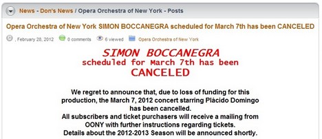 Již zítra večer měla být v Lincolnově centru v New Yorku koncertně uvedena Verdiho opera Simon Boccanegra. The Opera Orchestra of New York měl řídit Alberto Veronesi, v titulní roli nebyl ohlášen nikdo menší, než Plácido Domingo. Jenže – nedlouho před stanoveným termínem byl tento Simon Boccanegra nečekaně zrušen. Důvod? Peníze. Bez dalšího komentáře přinášíme jeden z celé řady zahraničních článků, které se newyorského zrušení provedení Verdiho opery s Domingem v hlavní roli věnují.