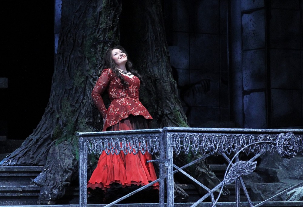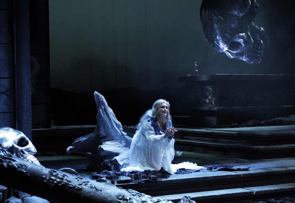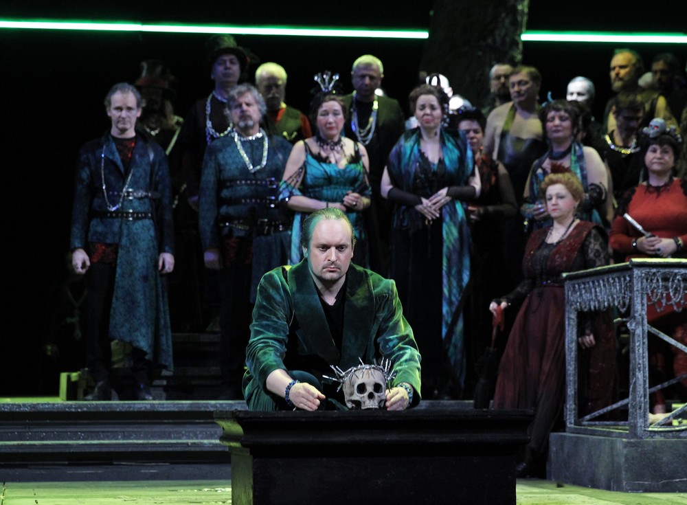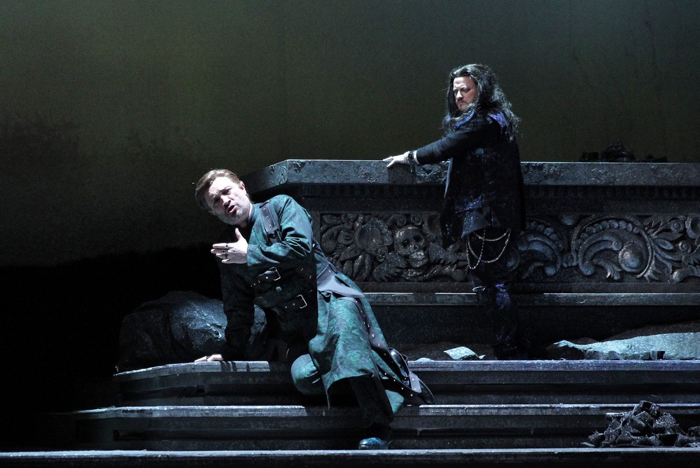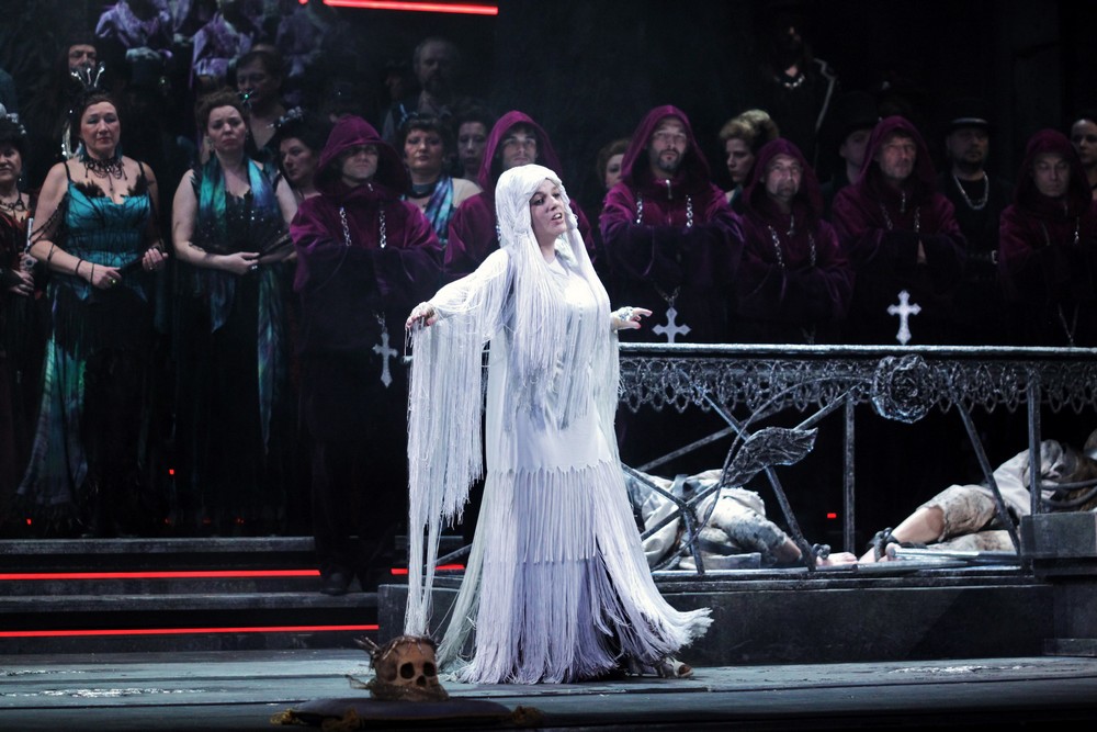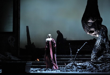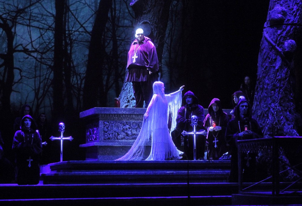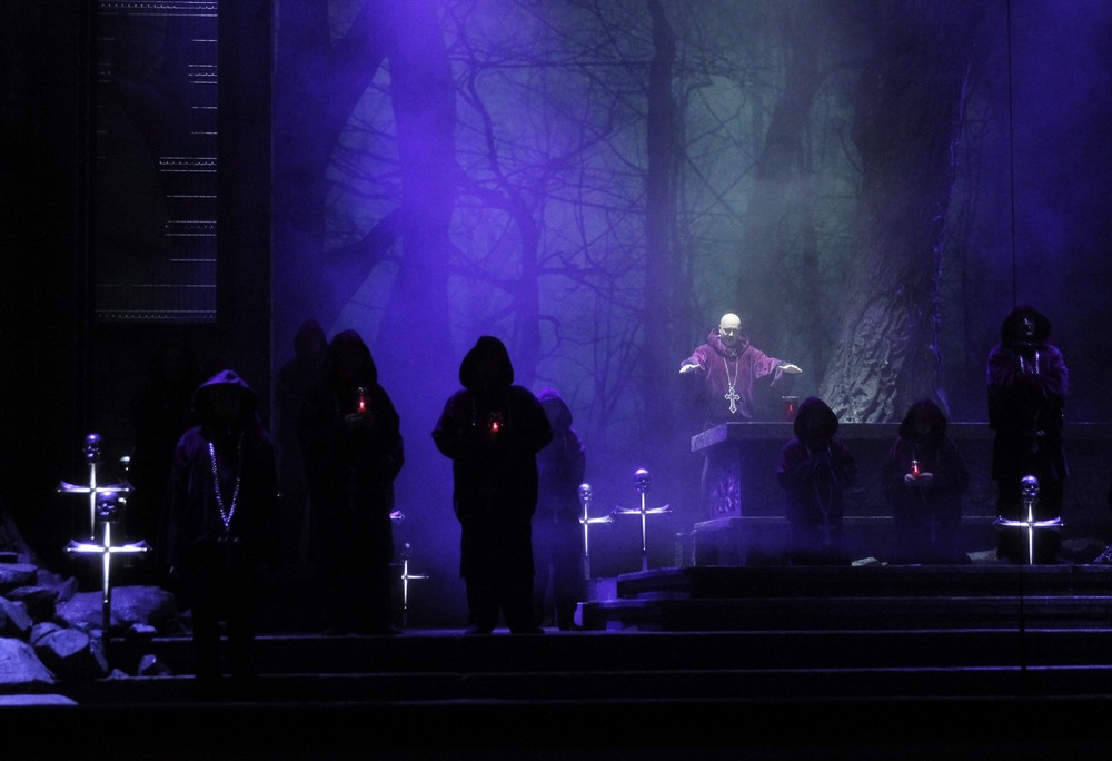 Realistická scéna Waltera Schütze působí efektně, v popředí obrovské kmeny stromů doplňuje projekce hustého větvoví s živými stíny poletujících ptáků. S tímto si inscenace vystačí na několik dějství s menšími obměnami – zmizí větve, spustí se honosný lustr a ejhle, jsme v paláci. Rychlé, účinné, pohledné řešení. Nebo jeden z mohutných kmenů se zvedne a v jeho kořenech se zaleskne obří stříbrná lebka – další efektní prvek, který při různém nasvícení tvoří optickou i významovou dominantu. Lebky, kříže, meče, krypta – to vše jsou prvky integrované do současné módy gothiků, hells angels nebo pankáčů. V této rovině tedy prolnutí současných kostýmů s historickými modely á la 16. století funguje (i když zajatí Vlámové vypadají spíš jako odbarvené blondýny v přestrojení, než drsní hoši s čírem). Méně se mi líbilo v dalších obrazech využití neonových prvků – trochu nesourodé s předchozí estetikou, stejně jako dlouhý závěr v málo podnětných kulisách spálené, zničené a pusté krajiny. Režie Manfreda Schweigkoflera nemíří do nějakých psychologických hlubin, ale ani nenudí. Pěvci se pohybují na scéně přirozeně, někdy je tam aktérů až trochu moc, že se davy na jevišti tísní. Navzdory délce představení bych neřekla, že jsou v něm hluchá místa, u Verdiho se stále něco děje, stačí nechat dílu přirozený průběh.+++