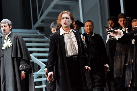 Francesco Bellotto so scénografom a kostýmovým výtvarníkom Angelom Salom spravili všetko preto, aby krvavé udalosti a mysterióznosť príbehu neskĺzali do paródie. Predlohu nepoňal v zmysle Cammaranovho zasadenia do Švajčiarska 15. storočia, ale skôr vyslyšal posolstvá francúzskej hry a kontext doby jej vzniku. Tá len krátko predbehla zrod samotnej opery. Výklad sa odvíja od Corradovej retrospektívy. Hospitalizovaný na psychiatrii prežíva fatálne udalosti svojho života, pričom rovina aktualizačná sa prelína s historickou. Každá z častí, ktoré nesú vlastné názvy (Testament, Zločin, Prízrak), dostáva v Bellottovom výklade dramatické napätie, ostro vykreslené charaktery a vďaka nápaditému výtvarnému rukopisu silnú atmosféru. Výprava je pritom veľmi úsporná. Základ tvorí schodisková zostava, ktorá sa prispôsobuje dynamike deja a ozvláštňujú ju veľmi citlivé projekcie. Pri kráčaní osôb po schodoch divák priam váha, či je to film, alebo tieň skutočnej postavy. Napriek tomu, že v scénach kde Enrico vstupuje priamo do deja (vrátane duelu s rivalom) boli akcie prispôsobené fyzickému handicapu tenoristu, hroty drámy ostali nabrúsené. Dokonca výjav súboja, po ktorom Corrado postreleného Enrica zmierlivo skladá z invalidného vozíka na zem, zamrazil ešte silnejšie.