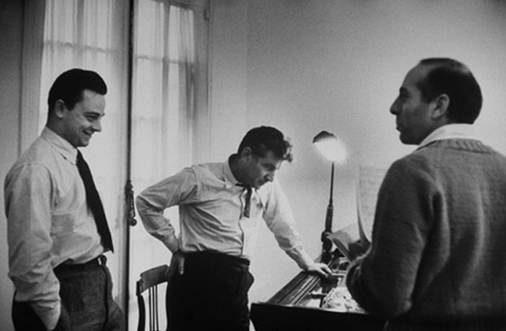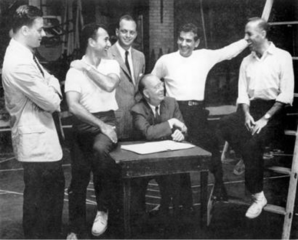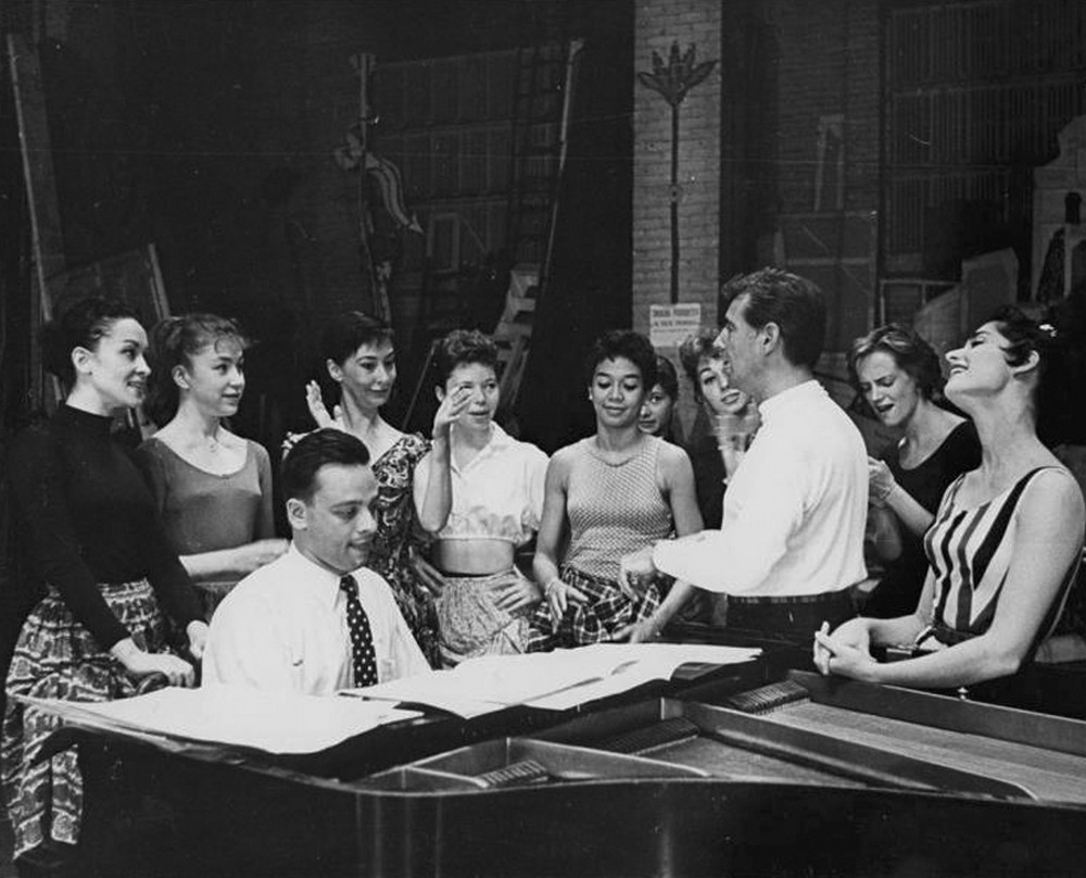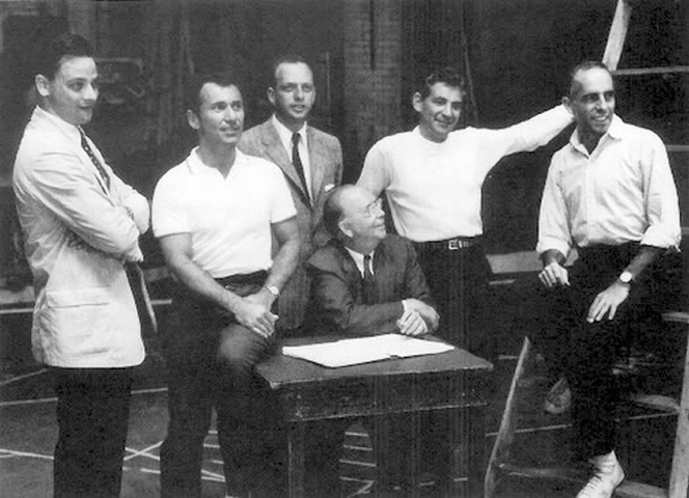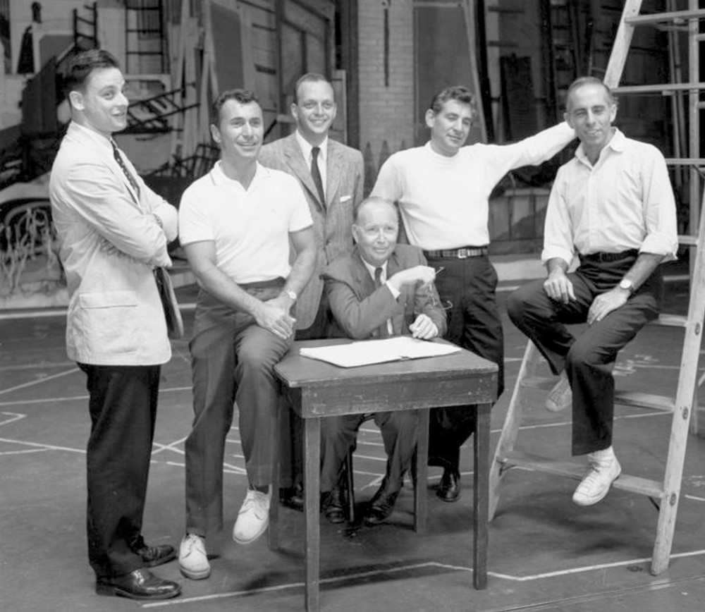 === Dvojice v oblecích, jíž patří ve skupině čestný střed, jsou producenti Robert Griffith (1905–1961, sedící) a Harold Prince (narozen 1928). Zkušený pán u stolu si v mládenci nad sebou cílevědomě vychovává nástupce, a úspěšný muzikál The Pajama Game, který spolu nedávno produkovali, jim zatím stále dává důvod k úsměvu. Budou se smát i po premiéře dalšího projektu? Sebevědomý muž na žebříku je přesvědčen, že ano. Jeho jméno zní Jerome Robbins (1918–1998) a patří k největším vizionářům mezi americkými choreografy. Téměř deset let usiluje o vytvoření taneční či muzikálové verze Shakespearova Romea a Julie. A stejně dlouho tímto tématem mučí svého souseda po pravici – populárního skladatele a dirigenta Leonarda Bernsteina (1918–1990). Už spolu pracovali na baletu Fancy Free a muzikálu On the Town; oba do jisté míry shodné příběhy se odehrávají v současném New Yorku, a právě tady vidí nadšený Robbins a dlouho skeptický Bernstein i své milence z Verony. O ději má „Jerry“ jasnou představu, hudbu i texty si bere na starosti „Lenny“, takže stačilo přibrat už jen autora dialogů. Stal se jím muž sedící na stole, Arthur Laurents (1917–2011), do té doby úspěšný dramatik a autor filmových scénářů, mimo jiné i pro Afreda Hitchcocka. A tím by měl být tvůrčí tým kompletní. Opravdu? Nikoli. Písňové texty Leonarda Bernsteina působí na jeho kolegy stále poněkud těžkopádně a falešně důležitě; Robbins i Laurents vědí, že to chce něco jiného. A zachránce se skutečně objeví: je to mladík zcela vlevo a jmenuje se Stephen Sondheim (narozen 1930). Připadá mu, jako by to bylo včera, kdy ještě jako školák zašel za sousedem a požádal ho o posouzení svého pokusu o muzikál. „Je to ta nejhorší věc, jakou jsem kdy viděl,“ prohlásil čtenář, jímž nebyl nikdo menší než broadwayská legenda Oscar Hammerstein II., „ale že jsi to ty, Steve, řeknu ti proč.“ Steve si nechal poradit, pilně studoval komponování, a navíc pracoval v různých pomocných profesích na jevištní přípravě muzikálů autorské dvojice Rodgers a Hammerstein II. Když se bystrý mladý muž seznámil s Robbinsovým projektem, okamžitě pochopil, že Bernsteinova hutná a téměř symfonická partitura potřebuje protiváhu v podobě jednoduchých, ne však banálních textů. Trefa do černého! Na poslední chvíli si Bernstein musel uhájit alespoň pozici jediného skladatele – Sondheim totiž podstatně zasáhl i do hudebního materiálu.