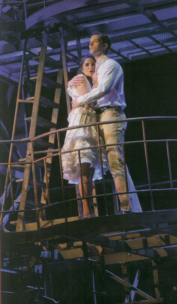 Toho času drážďanská West Side Story je každopádně nečekaně strhující zážitek. Výprava Paula Gallise přesvědčivě evokuje prostředí, které k tématu téměř ikonicky patří: staré činžovní domy, obehnané spletí protipožárních schodišť a žebříků, zde působivě zastupují mohutné kovové konstrukce po obou stranách jeviště. Pro velké taneční či ansámblové scény se tu tak otevírá volný a ničím nerušený prostor; v zadním plánu se buď promítají velké černobílé fotografie newyorských zákoutí padesátých let, nebo se jen mění jeho barevné tónování (světelný design Peter Halbsgut) podle momentální nálady v ději. Z konstrukcí se před očima diváků plynule vysouvají místnosti, představující pro příběh důležitý „obchod pro nevěsty“ nebo Mariin pokoj. A pokud je třeba, zaujmou obě postranní dekorace čelní postavení proti publiku. Vznikne tak jakýsi monumentální několikaposchoďový dům, který nabízí velkolepé prostředí třeba pro slavnou balkónovou scénu.