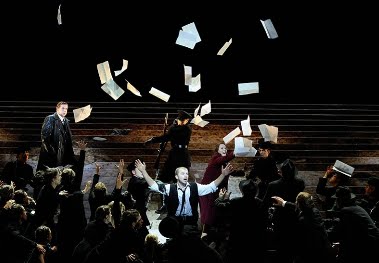 V rozhovoru s dramaturgyní režisér řekl, že v závěrečné scéně musí režisér učinit volbu: buď podlehne kýči a nechá proměnit Dafné ve strom, nebo předvede, že se jednalo o pouhou vraždu. Fischer si pochopitelně zvolil druhou možnost a z „bukolické tragédie“, jak Strauss s Gregorem své dílo označili, se rozhodl učinit dílo s hlubší výpovědí (že však má režisér možností více, ukázala např. inscenace ve vídeňské Staatsoper v roce 2004). Příběh mladé dívky, jež se odhodlá čelit totalitě, ztvárnil poměrně zdařile, místy i s dostatečnou sugestivností a drásavostí. Pokud ovšem nevíte, o čem je děj opery a nerozumíte německy – pak byste postřehli, že postavy většinou zpívají úplně o něčem jiném, než právě vidíte. A co hůř: o něčem jiném vypráví i Straussova hudba. Určité styčné body lze najít: v promítaném dopise Sophie píše o přírodě, i v posledních slovech se zmiňovala o krásném slunečném dni, ale závěrečná scéna proměny její oběti odporuje. I když snad lze Sophiino poselství vnímat jako výzvu k životu, zvukomalebná oslava přírody v závěru mi k němu neseděla. A zřejmě jsem nebyl jediný, protože bučení, jež patřilo režisérovi, překrylo ojedinělé výkřiky bravo.