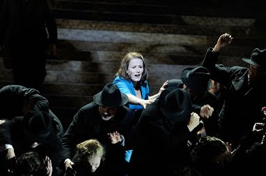 Nic z toho jsme na premiéře v drážďanské Semperoper neviděli. Režisér Torsten Fischer (o jeho vydařené vídeňské inscenaci Gluckovy Iphigenie na Tauridě jsem psal zde) se rozhodl vzdát poctu Sophii Scholl a její postavu s Dafné ztotožnil, přičemž děj pochopitelně přenesl do doby nacionálního socialismu. Sofie Scholl se spolu se svým bratrem angažovala ve studentské protinacistické skupině Bílá růže, založené na půdě mnichovské univerzity v polovině roku 1942. Pomáhala distribuovat letáky poukazující na nelegitimnost a zločinnost režimu a stala se jednou z vůdčích postav této organizace. V únoru 1943 byla (s bratrem a dvěma dalšími přáteli) zatčena a po čtyřech dnech popravena. Bylo jí pouhých 22 let. Díky tomu, že se zachovala akta lidového soudu, který ji odsoudil k smrti, a záznamy výslechů, víme, že se do posledních chvil projevovala statečně s neuvěřitelnou mravní silou: „Někdo už konečně musel začít. To, co jsme psali a říkali, si myslí i mnoho dalších. Jen nemají odvahu…“ prohlásila u soudu.