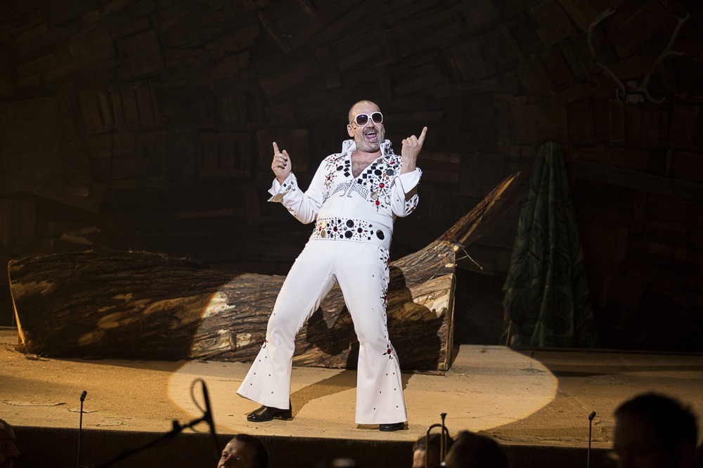 Tolik podob má láska… Že je publikum stále v lese, připomene na počátku čtvrtého aktu po bravurně zahrané orchestrální intrádě Dorothea Röschmann v rozkošné uniformě a kloboučku alpského myslivce, aranžujícího slavnost k poctě Oberonově. Taneční pár se hrabe z hromádky sena, Terry Wey a Joshua Ellicott si vystřihnou zvířecí scénu vysoké zvěře a kohouta, až se na scéně v dlouhém mysliveckém plášti objeví Florian Boesch. Žádný myslivec – pod pláštěm se skrývá Elvis Presley, angažovaný k Oberonově poctě a pobavení. Elvis sám je snad tím Oberonem, jehož adorují sboristé a jemuž holduje i pár Janková a Wey, dvojsmyslně si pochutnávající na lesních jahodách.