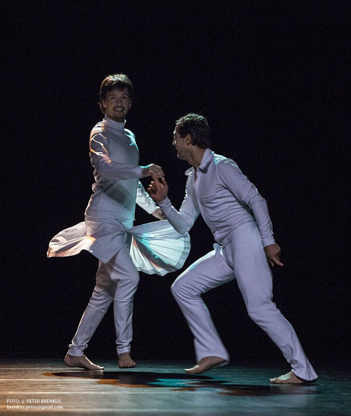 Scénu tvorí register reflektorov, ktoré si z času na čas posúvajú, niekedy ich sami obsluhujú. Svetlo vie byť biele, ale sú situácie, kedy sa rozžiari v celej škále farebného spektra a akosi aj táto svetelná farba dotvára humornosť jednotlivých scén. Tanečníci sú odetí do bielych kostýmov, z tmy „na bielo“ vystupujú a do tejto čistoty farby zahrnú aj čisté gesto. Sme na pomedzi zvyškov klasického spoločenského tanca až kdesi v baroku s úslužnými elegantnými archaizujúcimi úklonmi, ktoré pôsobia noblesne a úctivo, avšak tie sa mihnú ako esencia historickej kvality, zatiaľ čo sa tanečníci vskutku hýbu akoby improvizačne v smere súčasného tancovania bez pravidiel a kánonu. Kontrast týchto dvoch gestických štylizácií nás časovo presúva od rešpektovania tradícii až po aktuálne pohybové vyjadrenia.Prvý dotyk s Les Slovaks mal bratislavský divák v predstavení Off Beat – Live v interpretácii Milana Tomášika, spoluzakladateľa Les SlovaKs Dance Collective. Recenziu na toto predstavenie v štúdiu Slovenského národného divadla sme uviedli tu pod názvom Hra so vzduchom. Tomášik sa viac vracal tanečne do minulosti, jeho predstavenie bolo statickejšie a s koncentráciou na jedného tanečníka so živou muzikou na scéne.