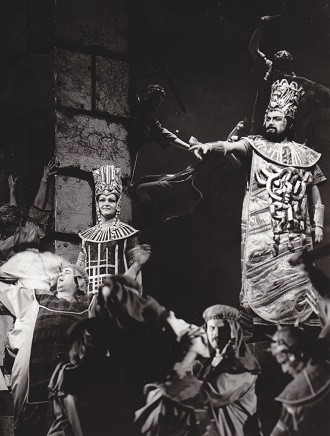 Giuseppe Verdi: Nabucco – Eva Zikmundová (Fenena), Libuše Domanínská (Abigailla), Jaroslav Horáček (Velekněz) a sbor – Smetanovo divadlo Praha 1965 (foto Jaromír Svoboda)