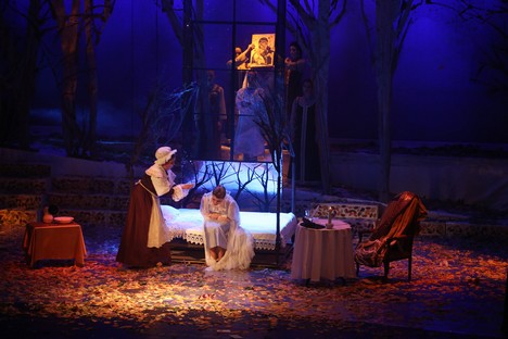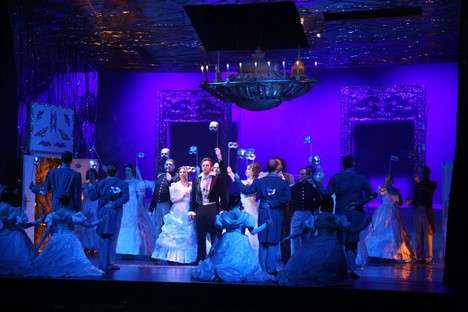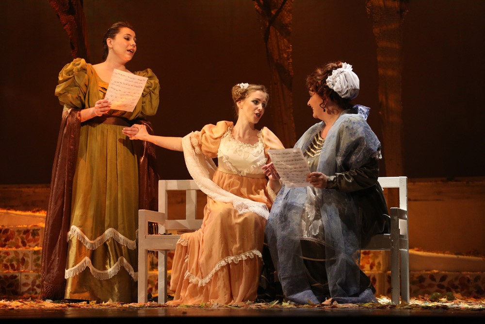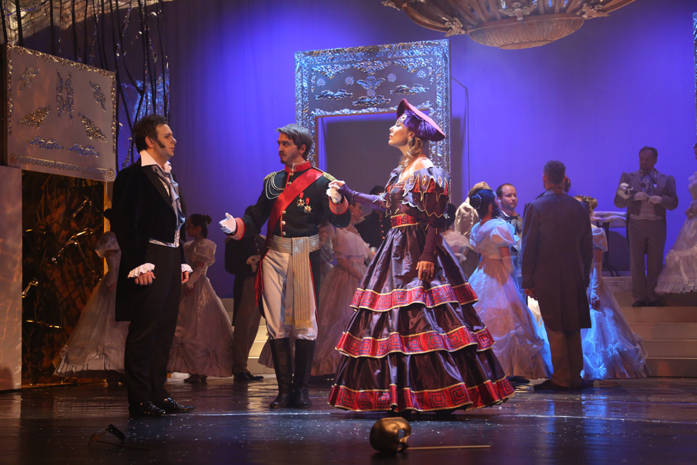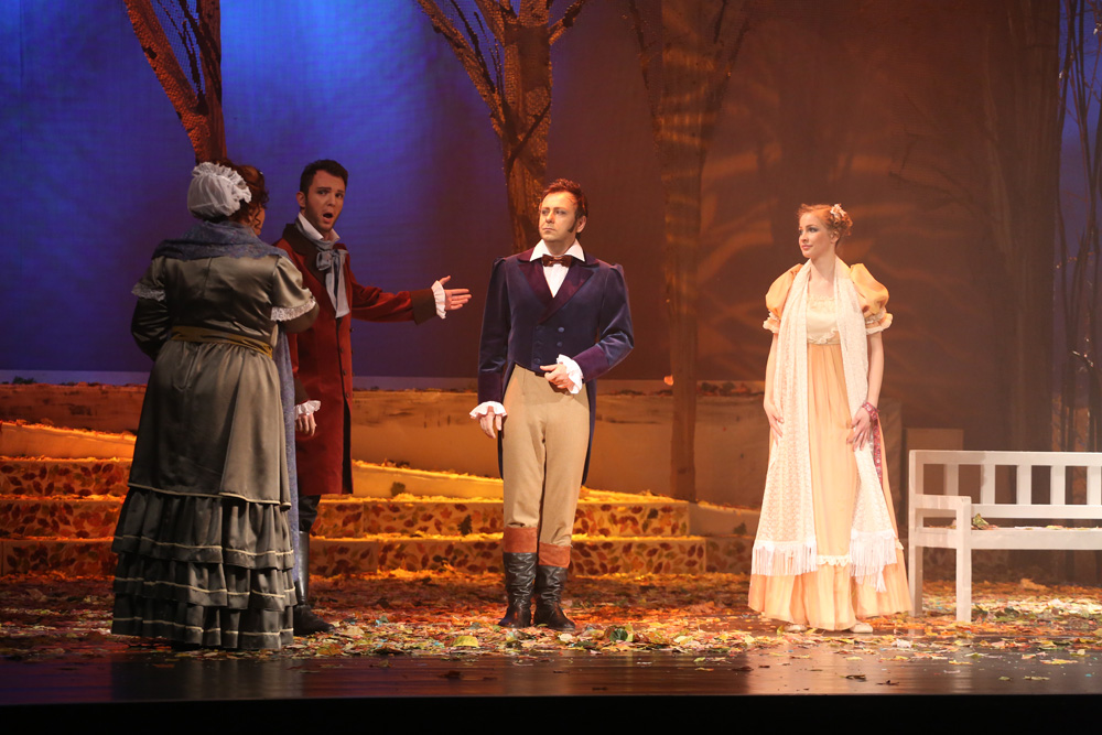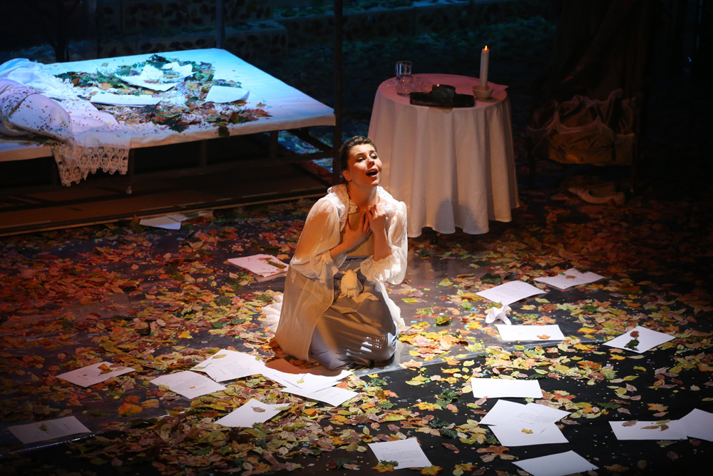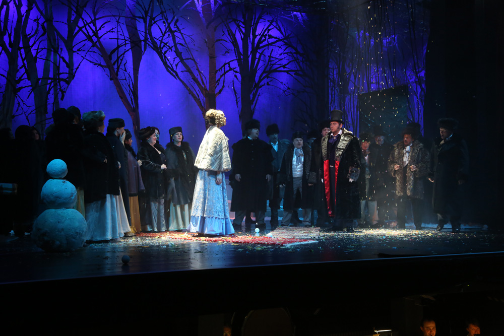 V danej chvíli a z dlhodobejšieho dramaturgického kontextu banskobystrickej Štátnej opery nemožno vzniesť námietky ani voči zaradeniu Eugena Onegina, naposledy uvedeného roku 1995. Diela, ktoré sa u nás v ostatnom desaťročí stalo doménou zahraničných inscenačných tímov. Po stále hranom a stále strhujúcom naštudovaní v Opere SND v réžii Petra Konwitschného (2005) a po krátkom javiskovom živote nevydarenej košickej verzie pripravenej Oľgou Kapaninou (2009), vložili v Banskej Bystrici partitúru do rúk mladej Petrohradčanky Anny Osipenko. Priniesla si do tímu svojich rodákov i rovesníkov, scénografa a kostýmového výtvarníka Sergeja Novikova a choreografa Michaila Čajkasova. Namieste boli teda predpoklady, že vznikne autentická, možno aj generačná výpoveď. Pohľad na zakonzervovaný, prísne realistický ruský model, je vo svete už dávno prežitý a predloha sa stáva kolbišťom možných i nemožných režisérskych výbojov.Anna Osipenko však žiadnym radikálom nie je. V princípe rešpektuje čo je v partitúre dané, jej posuny sú minimálne a motivované skôr snahou čo najintenzívnejšie dej zdramatizovať. Invenciu jej rozhodne uprieť nemožno, jej problémom je skôr triediť medzi nápadmi dramaturgicky nosnými a podružnými, využívanými viac pre vizuálny efekt. Preň je ochotná aj trocha vsúvať „medzi riadky“ partitúry, pokúšať sa stoj čo stoj ilustrovať myšlienkové pochody hrdinov a cifrovať javisko detailmi až spoza hrany operetnej estetiky. Jednoducho, u Osipenkovej a Novikova by neraz menej znamenalo viac. Do jesenných farieb zarámované (doslova, pretože aj strop javiska je pokrytý zrkadliacou plochou) prvé dejstvo hýrilo farebnými odtieňmi daného ročného obdobia a množstvo popadaných listov sa stalo „rekvizitou“, ktorú účinkujúci opakovane vyhadzovali do vzduchu. Prvý pohľad na Tatianu je zo zeme a do tejto polohy režisérka rada a často zbytočne štylizuje svojich hrdinov. Zbor je od prvého vstupu herecky veľmi aktívny, dokazujúci že Anna Osipenko mala svoju koncepciu detailne premyslenú aj v komparzoch. Pozorovateľné sú tiež autentické mizanscény, zjavne inšpirované ruskými ľudovými zvyklosťami. Druhý obraz ponecháva s pozadím lesa a Tatianina izba je oddelená len symbolickým „okenným“ panelom. Tento spôsob plynulého prechodu je pomerne často využívaný, aj keď trocha ukrajuje z intímnosti „listovej“ scény a prieči sa realistickým princípom réžie.