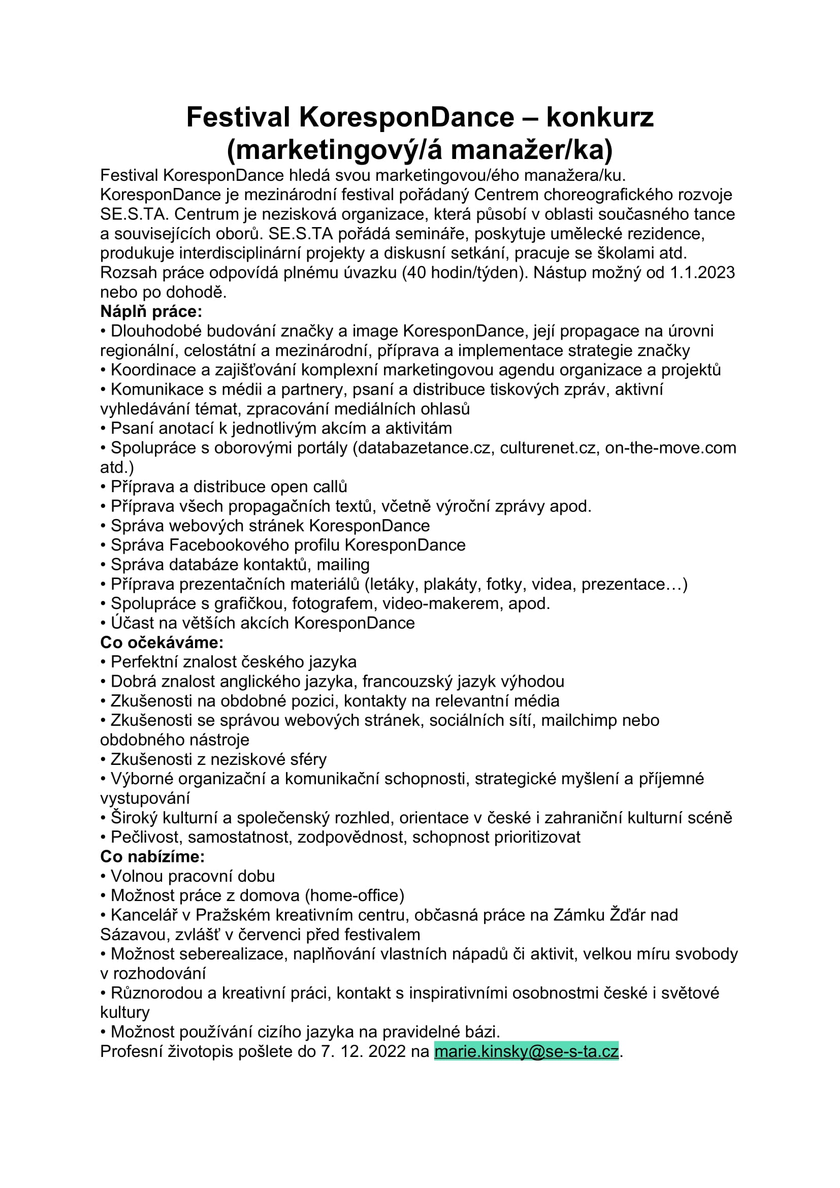 Festival KoresponDance vyhlašuje konkurz na marketingového manažera