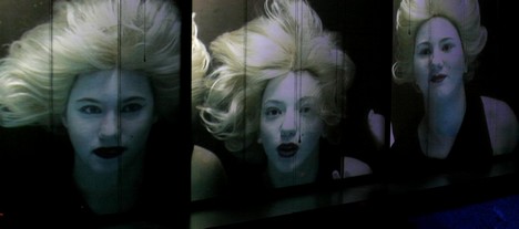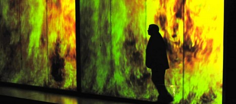 S úvodnými tónmi predohry Zlata Rýna sa sklená tabuľa postupne „zapľňa“ skalenou vlniacou sa vodou, do ktorej sa z času na čas projikujú tváre plávajúcich vodných víl sledujúcich počínanie spievajúcej Woglindy, Wellgundy, Flosshildy a Albericha. Šikmá presklená plocha sfarbená do zlata symbolizuje riečny poklad až do momentu ulúpenia. Stačí sekunda a scéna sa mení – blankytná obloha s obrovským žeriavom symbolizujúca práve dostavané nebeské obydlie pre bohov. Na hranici vkusnosti pôsobia obrovské hlavy Fasolta a Fafnera – bábky vodené na tyči. Rovnako Wotanove havrany v podobe vypchatých vtákov sú zbytočnou triplicitnou formou ich spodobenia (popri videoprojekcii a dvoch tanečníkoch v čiernych kostýmoch s obrovskými krídlami).