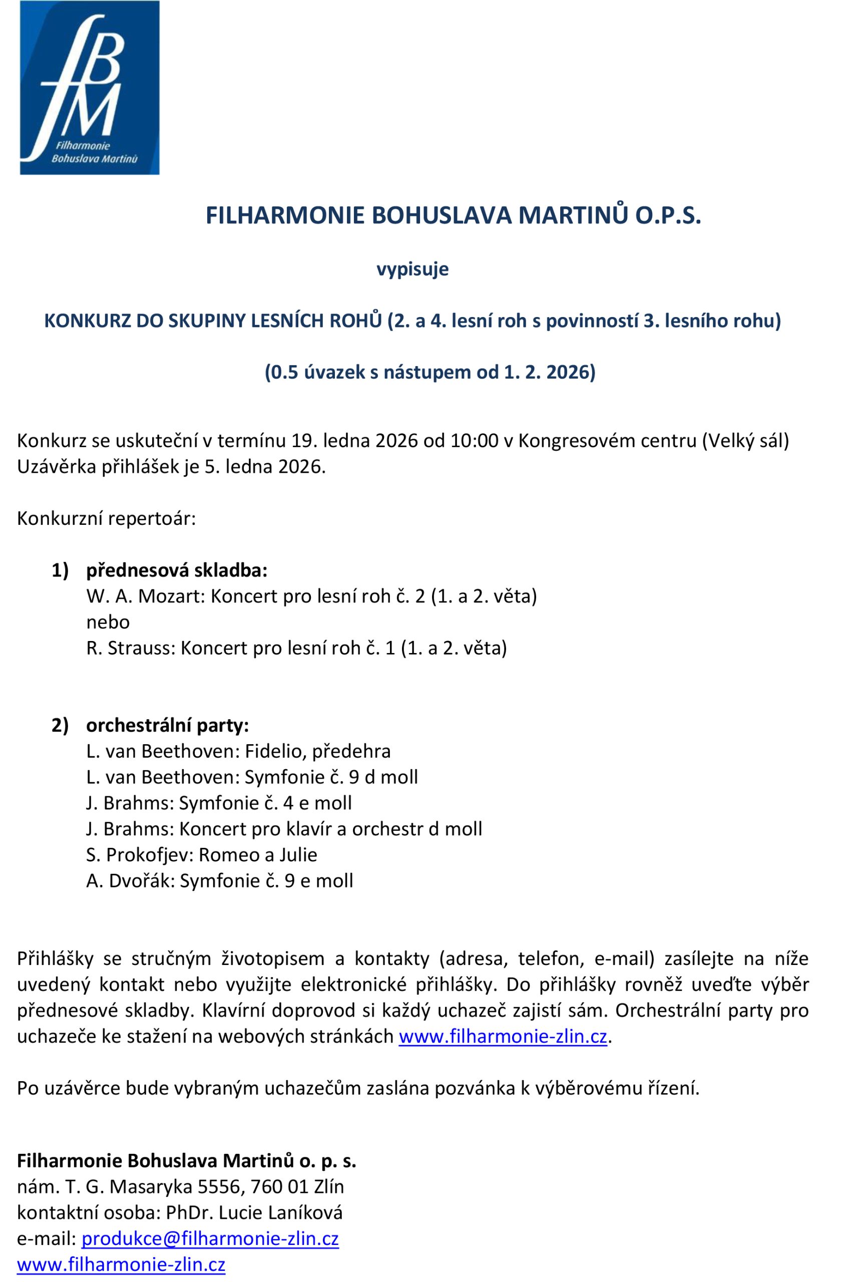 Inzerce Filharmonie Bohuslava Martinů vypisuje konkurz do skupiny lesních rohů Publikováno 30/11/2025 sdílejte: 0 minut čtení sdílejte: TémataSeznam inzerátů Sdílet článek Facebook email zkopíruj odkaz vytisknout sdílejte: Předchozí článek Album týdne Normana Lebrechta: Když Šostakovič skládá jen kvůli výdělku Další článek Tanečníci tanečníkům: Romeo a Julie v Bratislavě jako dědičné trauma ženského rodu 0 0 hlasy Ohodnoťte článek Odebírat Přihlášení Upozornit na nové a další komentáře nové odpovědi na můj komentář Label {} [+] Jméno* E-mail* Webová stránka Label {} [+] Jméno* E-mail* Webová stránka 0 Komentáře Nejstarší Nejnovější Most Voted Inline Feedbacks Zobrazit všechny komentáře Načíst další