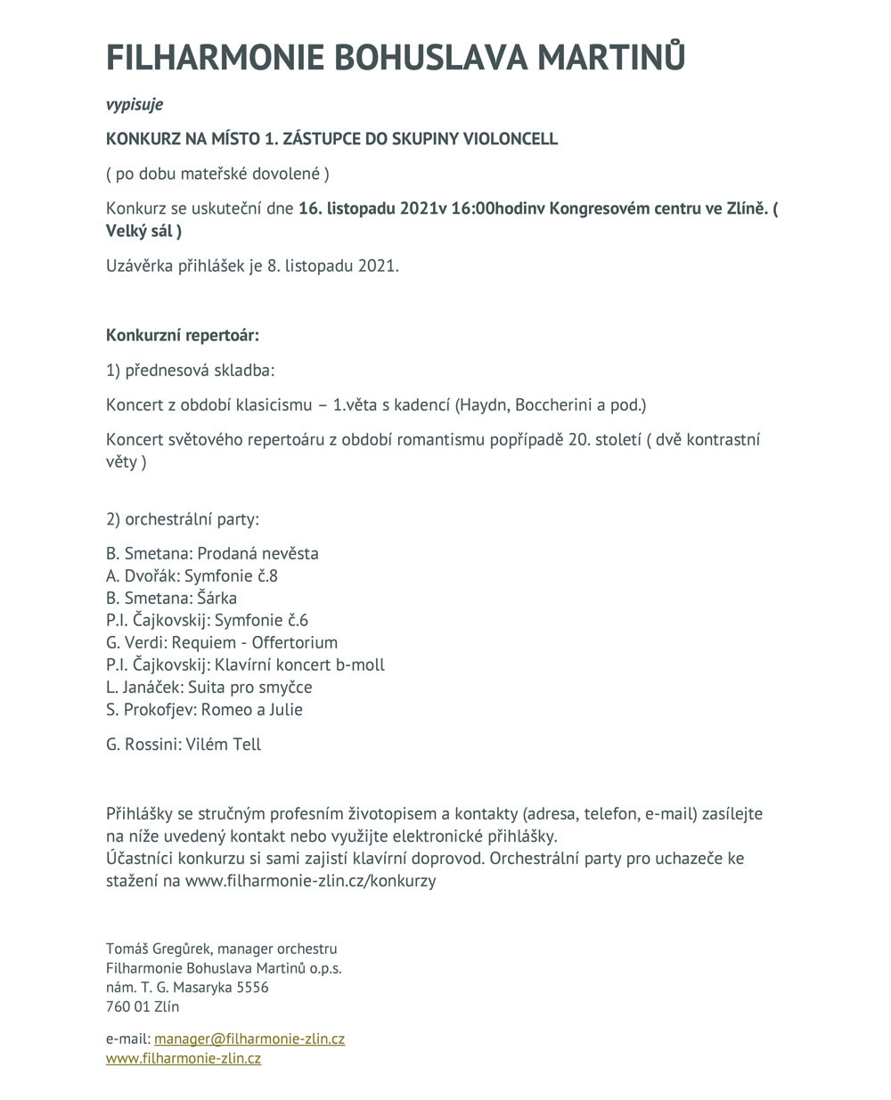 Inzerce Filharmonie Bohuslava Martinů vypisuje konkurz na 1. zástupce do skupiny violoncell Publikováno 09/10/2021 sdílejte: 0 minut čtení sdílejte: TémataSeznam inzerátů Sdílet článek Facebook email zkopíruj odkaz vytisknout sdílejte: Předchozí článek Dramaturgyně Hana Dohnálková: Řada posluchačů se zalekne jen při zmínce o soudobé hudbě Další článek Supraphon vydává album Dominika Wollenwebera, předního hráče na anglický roh 0 0 hlasy Ohodnoťte článek Odebírat Přihlášení Upozornit na nové a další komentáře nové odpovědi na můj komentář Label {} [+] Jméno* E-mail* Webová stránka Label {} [+] Jméno* E-mail* Webová stránka 0 Komentáře Nejstarší Nejnovější Most Voted Inline Feedbacks Zobrazit všechny komentáře Načíst další