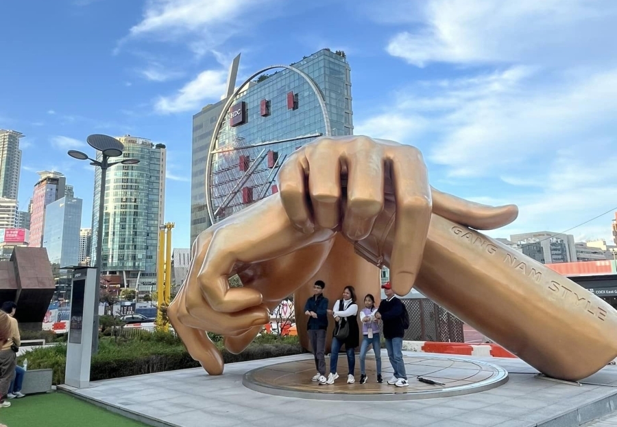 Místní jsou mu za to vděční, a tak leckde v okolí najdete nejen vyobrazení a sochy autora samotného, ale dokonce i základního tanečního prvku z jeho videoklipu, kterým je vířivý pohyb překřížených zápěstí. I ty mají v Gangnamu svojí vlastní obří sochu. Zatímco sever Soulu patří historii, palácům, zahradám, tradičním suvenýrům a turistům, jih patří obchodu, konzumu, penězům, popkultuře, zde konkrétně K-popu. V okolí hlavní zastávky Gangnam station najdete spoustu malých a vyhlášených hospůdek, bister, pouličních stánků i luxusních restaurací. Jednou z nich je i plzeňská hospoda Na zdraví s točeným pivem, a dokonce se smaženým sýrem a hranolky.