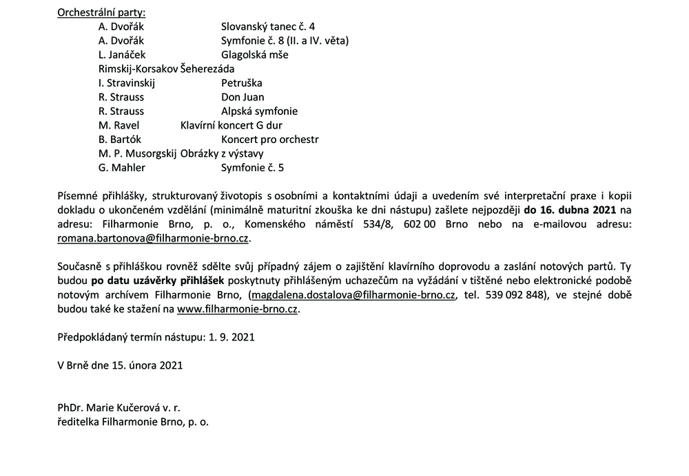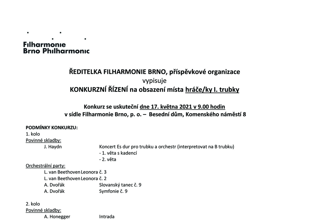 Inzerce Filharmonie Brno vypisuje konkurz na obsazení místa hráče I. trubky Publikováno 23/02/2021 sdílejte: 0 minut čtení sdílejte: TémataSeznam inzerátů Sdílet článek Facebook email zkopíruj odkaz vytisknout sdílejte: Předchozí článek Služba Spotify expanduje do 85 zemí Další článek Na koncertě Moravské filharmonie zazní unikátní premiéra srbské skladby 0 0 hlasy Ohodnoťte článek Odebírat Přihlášení Upozornit na nové a další komentáře nové odpovědi na můj komentář Label {} [+] Jméno* E-mail* Webová stránka Label {} [+] Jméno* E-mail* Webová stránka 0 Komentáře Nejstarší Nejnovější Most Voted Inline Feedbacks Zobrazit všechny komentáře Načíst další