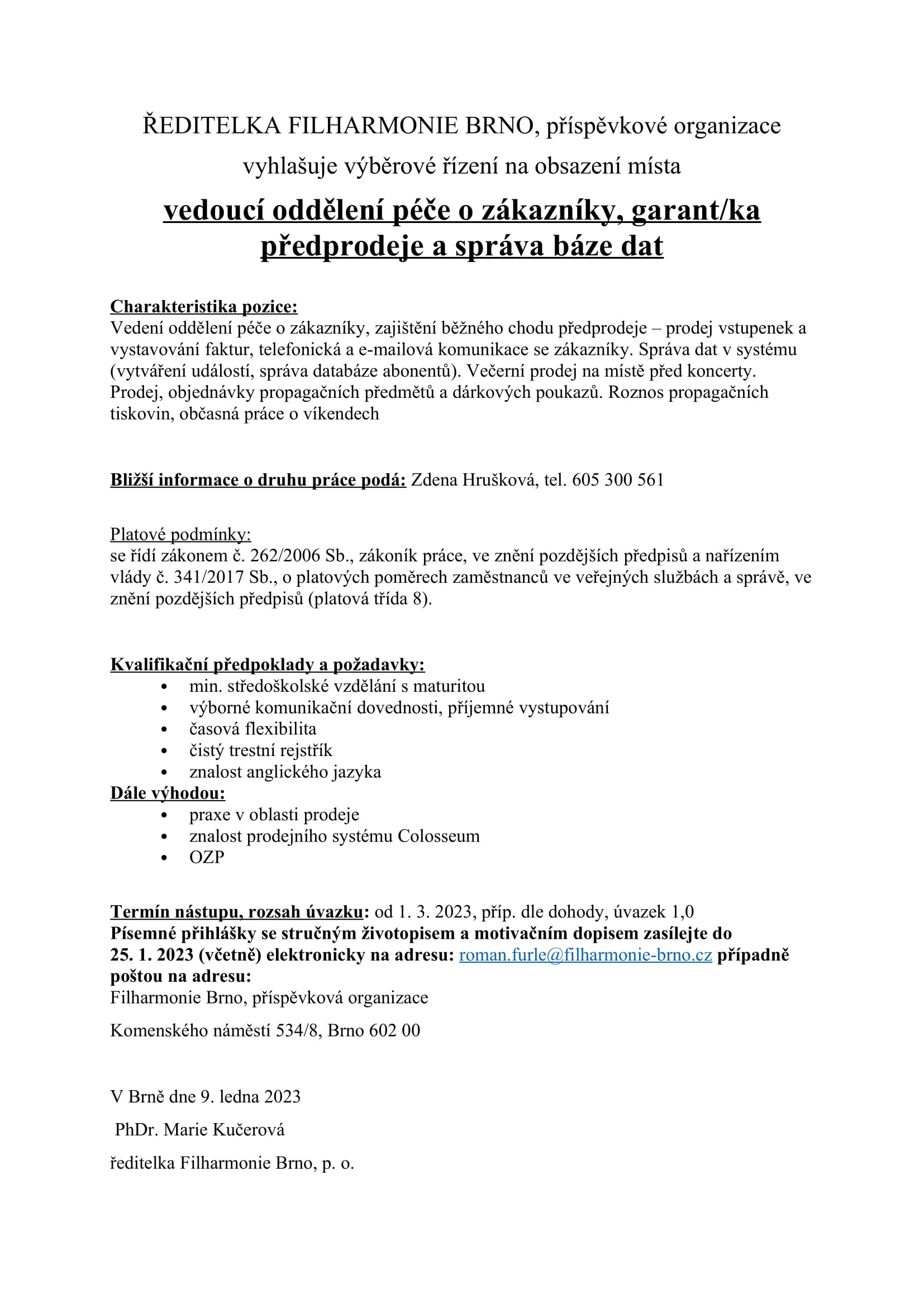 Inzerce Filharmonie Brno vypisuje výběrové řízení na obsazení místa vedoucí péče o zákazníky, garant předprodeje a správa báze dat Publikováno 18/01/2023 sdílejte: 0 minut čtení sdílejte: TémataSeznam inzerátů Sdílet článek Facebook email zkopíruj odkaz vytisknout sdílejte: Předchozí článek Dům umění v Piešťanech se stal opět součástí Slovenské filharmonie Další článek Projekt Kalabis100 oslavuje sté výročí narození Viktora Kalabise 0 0 hlasy Ohodnoťte článek Odebírat Přihlášení Upozornit na nové a další komentáře nové odpovědi na můj komentář Label {} [+] Jméno* E-mail* Webová stránka Label {} [+] Jméno* E-mail* Webová stránka 0 Komentáře Nejstarší Nejnovější Most Voted Inline Feedbacks Zobrazit všechny komentáře Načíst další