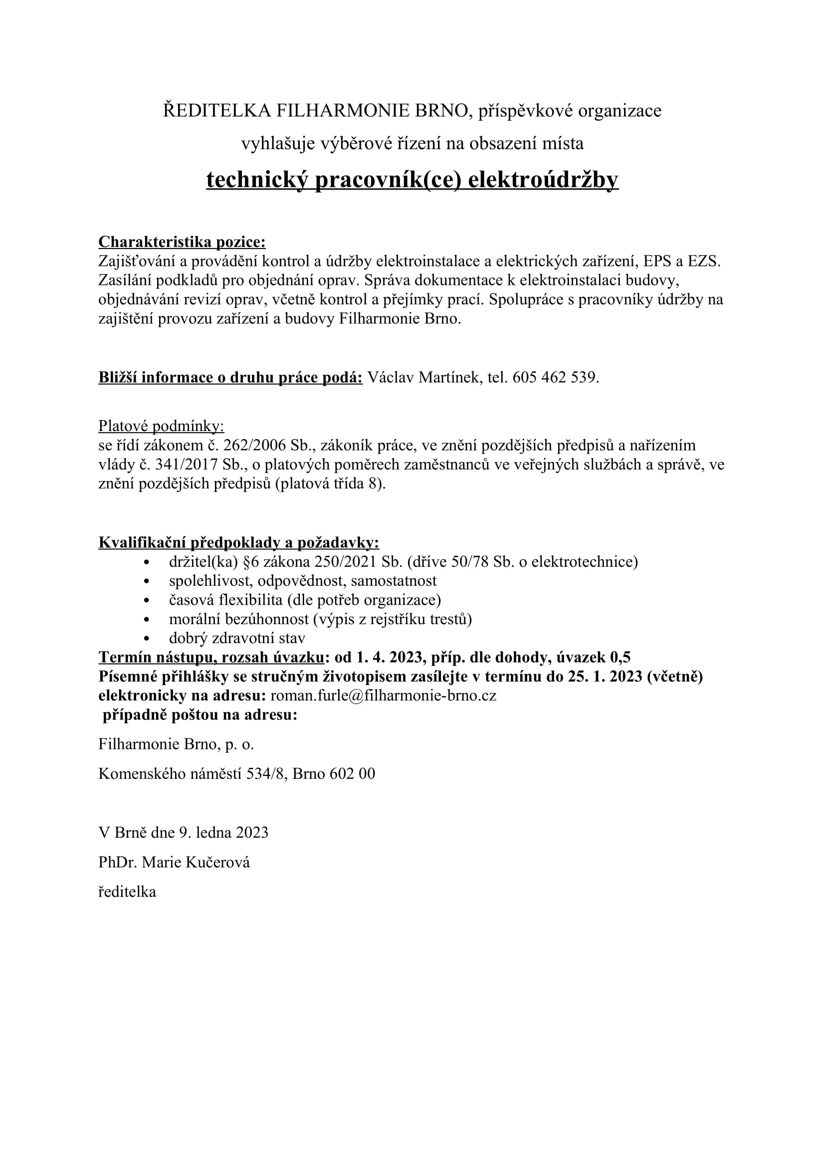 Inzerce Filharmonie Brno vypisuje výběrové řízení na pozici technického pracovníka elektroúdržby Publikováno 20/01/2023 sdílejte: 0 minut čtení sdílejte: TémataSeznam inzerátů Sdílet článek Facebook email zkopíruj odkaz vytisknout sdílejte: Předchozí článek Kontrabasista Indi Stivín: Hudba je pro mě celý vesmír Další článek Největší varhany v Evropě byly slavnostně představeny v Katovicích 0 0 hlasy Ohodnoťte článek Odebírat Přihlášení Upozornit na nové a další komentáře nové odpovědi na můj komentář Label {} [+] Jméno* E-mail* Webová stránka Label {} [+] Jméno* E-mail* Webová stránka 0 Komentáře Nejstarší Nejnovější Most Voted Inline Feedbacks Zobrazit všechny komentáře Načíst další