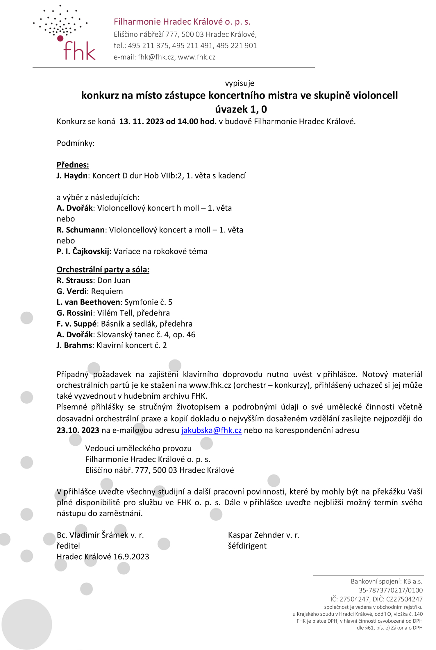 Čtení Filharmonie Hradec Králové vypisuje konkurz na místo zástupce koncertního mistra ve skupině violoncell