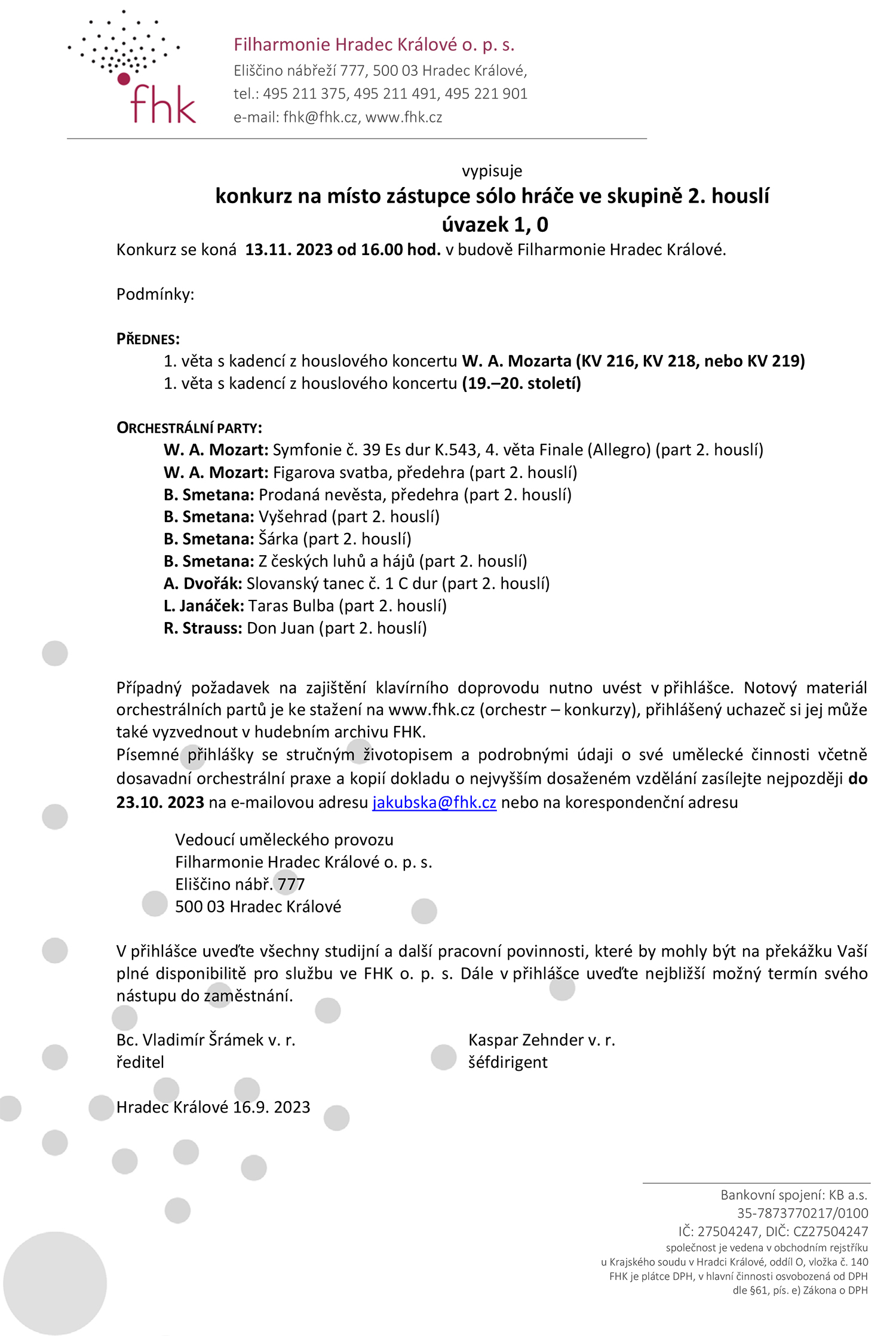 Inzerce Filharmonie Hradec Králové vypisuje konkurz na místo zástupce sólo hráče ve skupině 2. houslí Publikováno 11/10/2023 sdílejte: 0 minut čtení sdílejte: TémataSeznam inzerátů Sdílet článek Facebook email zkopíruj odkaz vytisknout sdílejte: Předchozí článek Soutěž o vstupenky: Premiéra inscenace Tremula ve Studiu ALTA Další článek PKF — Prague Philharmonia: Hudební talk show se přesouvá do Studia Švandova divadla 0 0 hlasy Ohodnoťte článek Odebírat Přihlášení Upozornit na nové a další komentáře nové odpovědi na můj komentář Label {} [+] Jméno* E-mail* Webová stránka Label {} [+] Jméno* E-mail* Webová stránka 0 Komentáře Nejstarší Nejnovější Most Voted Inline Feedbacks Zobrazit všechny komentáře Načíst další