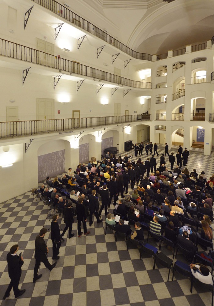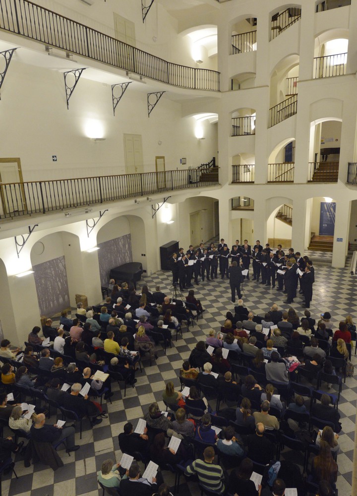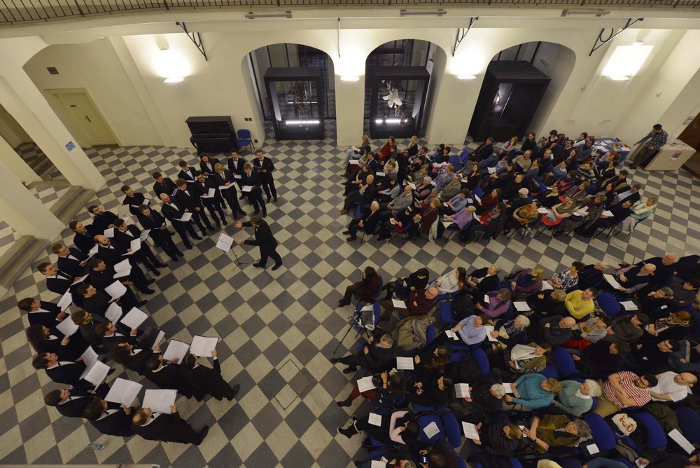 Bohužel, počasí moc nepřálo, ale déšť nezabránil v zazpívání hymny Zachovej nám, Hospodine. Následovala návštěva dalších památných míst v Praze a na každém z nich píseň, která se k příslušné lokalitě nějak vázala. K večeru pak průvod po náročném odpolední dorazil do Českého muzea hudby v Karmelitské ulici. Následoval převlek do gala a příchod v dlouhém zástupu skrze publikum do čela sálu. Sbormistr Jan Špaček krátce promluvil o kompletním nastudování Smetanových mužských sborů, které pak sbor v krásné centrální dvoraně muzea provedl. Jednalo se celkem o jedenáct skladeb.+++
