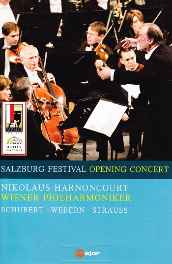 Od roku 1984 jediným, za to však jedinečným dirigentovým schubertovským snímkem na komerčních hudebních nosičích, vzešlým ze spolupráce s Vídeňskými filharmoniky, je live DVD záznam zahajovacího koncertu Salcburského festivalu 26. 7. 2009 (C Major v koprodukci s ORF, ZDF, Arte a Unitel Classica 1 DVD 702708), který byl vlastně jakousi dirigentovou poctou Rakousku a jeho hudební kultuře. V jednom programu se tak vedle sebe ocitlo Schubertových Šest německých tanců D 820 v aranžmá Antona Weberna, polky Pel-mel op. 161 a Srdce žen op. 166 a valčík Deliria op. 212 Josefa Strausse (1827–1870) a Schubertova Symfonie C dur D 944. Dramaturgicky bych tuto kombinaci označil za naprosto jedinečnou a postavil ji hned do sousedství berlínského projektu z ledna 1995. Finálnímu výsledku obzvláště napomohlo komornější obsazení Vídeňských filharmoniků s pěti kontrabasy a Rainerem Honeckem u pultu prvních houslí nebo Xavierem de Maistre u harfy. Účinek méně početného obsazení je nepopiratelný, především v nižší dynamice (violoncella ve středních hlasech I. věty symfonie) a ve zvukovém partnerství dřevěných dechových nástrojů (klarinety v Německých tancích a symfonii). Nepopiratelnému úspěchu snímku napomáhá i obrazový záznam, kterému se podařilo zabydlet rozlehlé podium Velkého festivalového domu: když se spíše statická kamera najednou rozpohybuje v klimaxu II. věty Symfonie C dur a přes hlavy filharmoniků zamíří k dirigentovi, přeběhne televiznímu divákovi mráz po zádech. Obrazový záznam zachycuje i reakce konsternovaného festivalového publika: tleskalo opatrně až po druhé skladbě první poloviny koncertu a zjevně čekalo více kantability v Schubertově symfonii, která se proměnila v tanec smrti. V žádném jiném snímku tohoto díla, ani Harnoncourtově, jsem dosud neslyšel literárně nevyjádřený hudební program této symfonie vystoupit tak zřetelně, jako tomu je v tomto snímku. Žádná orchestrální sonáta, žádná poklona rakouskému venkovskému folklóru. Každému, jen trošku soustředěnému posluchači musí být najednou jasné, že v těch pochodových rytmech a fanfárkách I. a II. věty se ukrývá příběh poutníka, možná vysloužilého vojáka, putujícího skutečnou, nebo ještě lépe sněnou krajinou poznamenanou válkou. Zvuky polnice, pevný rytmus pochodu (I. věta), úzkost, sténání a výkřiky umírajících (II. věta), zastaveníčko ve venkovské hospodě (III. věta) a oslava (rádoby) vítězství s voláním po sbratření národů (onen beethovenovský citát ve IV. větě) jsou skrytým obsahem díla, duchovně navazujícího na závěrečné díly mešního ordinária (Agnus Dei) v Haydnově Mši za časů války a Beethovenově Slavnostní mši D dur. Zvrásněné frázování I. věty, akcentace komentujících středních hlasů, extrémně kontrastní dynamika, tajuplný úvod k II. větě, taneční akcenty v rytmicky pointovaném scherzu jsou jen důležitými detaily záznamu koncertu, který ukazuje, jak sdělným a působivým, ano, až otřesným, může být arcikonzervativní program koncertu na počátku 21. století. Tuhle Schubertovu Leningradskou je zkrátka třeba slyšet a apoteózu rakouské taneční hudby i vidět.