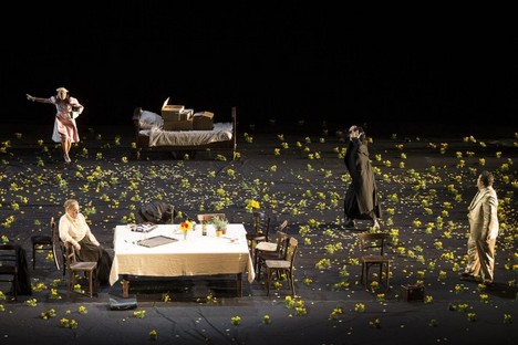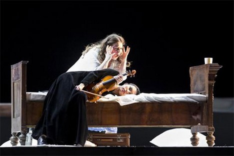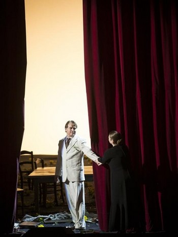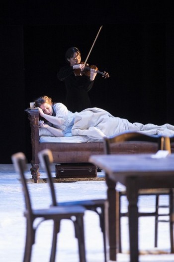 Tie isté scénické elementy (stôl so stoličkami a posteľ) dominujú aj ďalším dejstvám. Na pódiu niet stien, dverí a okien, prázdny priestor uzatvára čierny horizont. V druhom obraze sa pomocou točne mení len umiestnenie stola a postele. Raz sú vpredu, raz vzadu. Podstatné u Konwitschného sú charaktery postáv a vzťahy. Ako vždy, vychádza z hudobnej analýzy partitúry, z ktorej mu vyplynulo zaujímavé riešenie. Scénu Jenůfy s husľovým sólom v orchestri poňal ako dialóg hlavnej predstaviteľky s nástrojom, sťaby zjavením. Preto koncertnú majsterku vytiahol na javisko a zapojil do akcie.