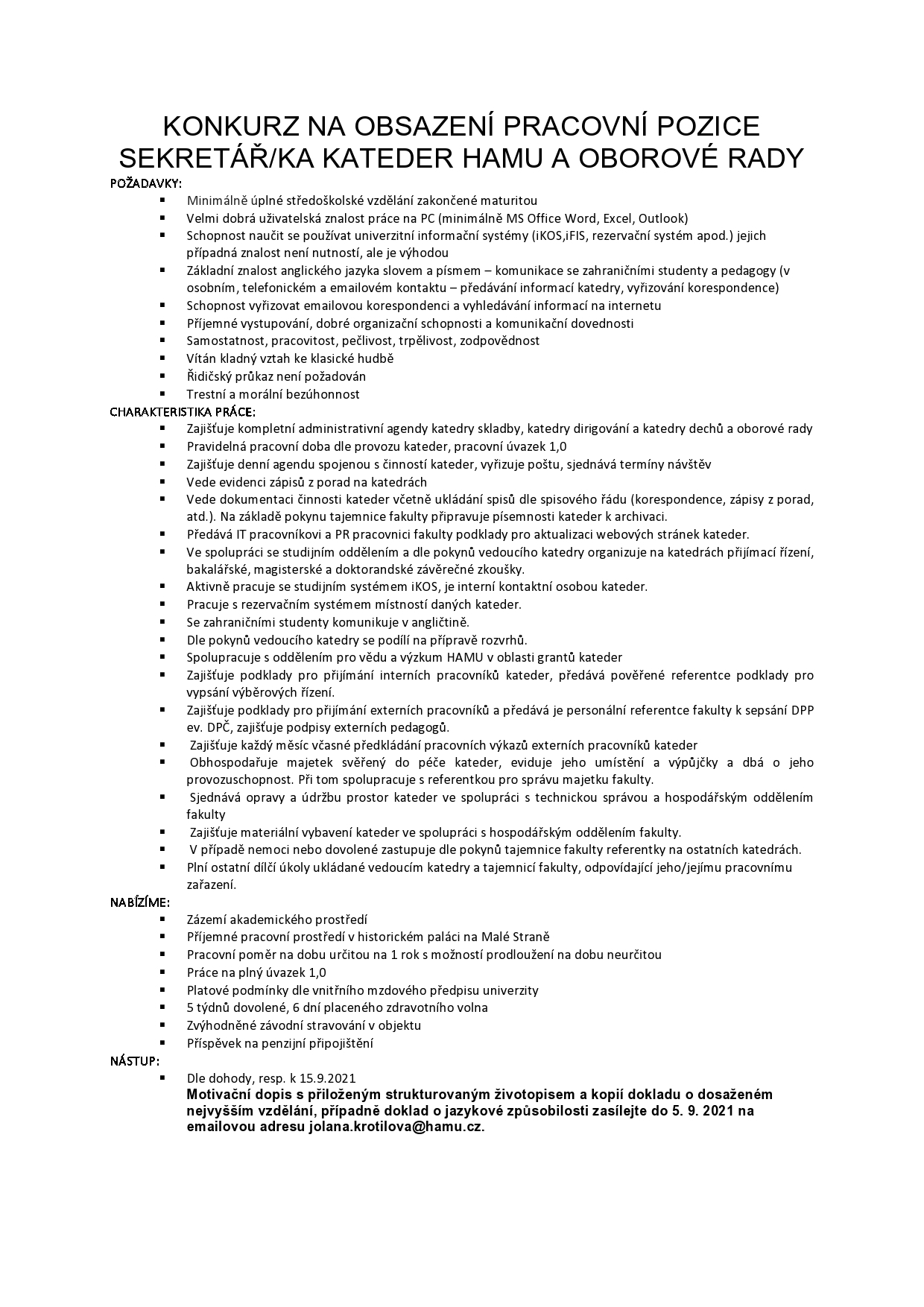 Inzerce HAMU vypisuje konkurz na sekretáře/sekretářku kateder HAMU a odborové rady Publikováno 21/08/2021 sdílejte: 0 minut čtení sdílejte: TémataSeznam inzerátů Sdílet článek Facebook email zkopíruj odkaz vytisknout sdílejte: Předchozí článek Oběť požaduje po zemřelém dirigentu Levinovi odškodné za sexuální zneužívání Další článek Album týdne Normana Lebrechta: Ernő Dohnányi – Teta Simona a Americká rapsodie 0 0 hlasy Ohodnoťte článek Odebírat Přihlášení Upozornit na nové a další komentáře nové odpovědi na můj komentář Label {} [+] Jméno* E-mail* Webová stránka Label {} [+] Jméno* E-mail* Webová stránka 0 Komentáře Nejstarší Nejnovější Most Voted Inline Feedbacks Zobrazit všechny komentáře Načíst další