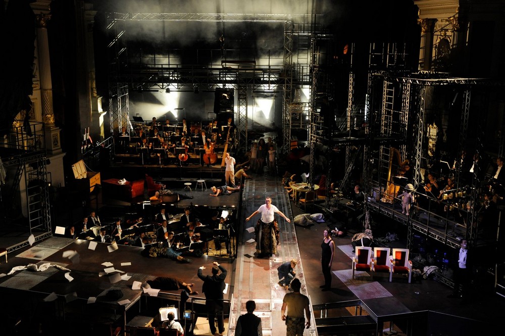 Jak jsem již zmiňoval, extrémně náročné je nastudování tohoto díla pro orchestr a pěvce. Ve více než stovce rolí odvádí přes padesát sólistů nejenom těžko zapamatovatelné hudební party, ale i veskrze náročné herecké studie. Orchestrální hráči rozmístění prakticky všude možně po divadle mohou jen těžko sledovat dirigenta (Američan Erik Nielsen) přímo a musí se spolehnout na monitory a svoji intuici a profesionalitu. Z tohoto pohledu je nastudování takto monumentálního díla pro pět repríz více než obdivuhodné. O finanční náročnosti celého projektu ani nemluvě. Všichni sólisté se přitom svých úkolů zhostili nanejvýš profesionálně, totéž platilo i o sboru a četných statistech. V každém okamžiku jste navíc měli pocit autentičnosti.