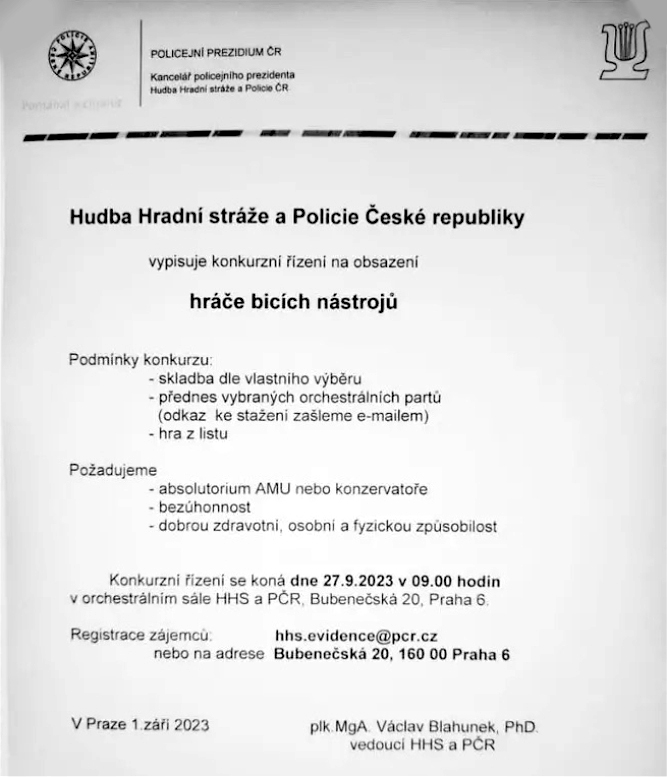 Čtení Hudba Hradní stráže a Policie ČR vypisuje konkurz na obsazení hráče bicích nástrojů