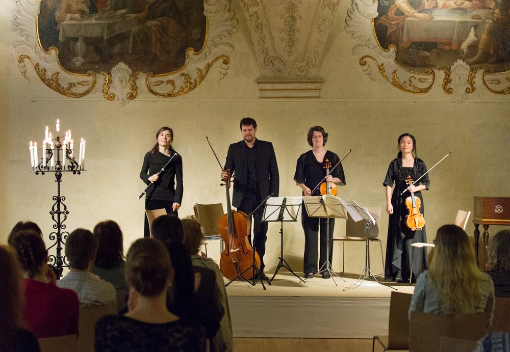 Program zahájil Flétnový kvartet D dur pro flétnu, housle, violu a violoncello, KV 285, Wolfganga Amadea Mozarta, což napovídal již samotný název koncertu. Flétnové kvartety totiž Mozart napsal v Mannheimu na objednávku zámožného holandského obchodníka, kterému pro jeho působení ve Východoindické obchodní společnosti přezdívali Ind. Jako sólistka vystoupila Anne Freitag na klasicistní flétnu, smyčcové nástroje obsadili Anaïs Chen (housle), Martina Bischoff (viola) a Daniel Rosin (violoncello). Hudebníci volili v rychlých větách velmi svižná tempa, v nichž však nechyběla lehkost a hravost a zároveň vše bylo příjemně přehledné. Hudba byla vystavěna nesmírně plasticky, což podpořila bohatá práce s artikulací, agogikou i dynamickými změnami, a vzájemná komunikace mezi instrumentalisty byla výborná. Výkon Anne Freitag byl bravurní po technické i estetické stránce a zvuk nástroje byl velmi měkký a příjemně se pojil se smyčci. Musím ocenit také velmi dobrou intonaci, zejména v nepříjemných chromatických postupech, které na jednoklapkovém nástroji nejsou nijak snadné. Smyčcové nástroje v Kvartetu mají většinou spíše doprovodnou úlohu, ale sólovou flétnu podpořili skutečně dobře. To bylo nejvíc patrné v Adagiu, které bych rád zmínil. Pizzicato smyčců má obvykle podobu statických figur, nad nimiž flétna „zpívá“ tklivou mollovou melodii. Na sobotním koncertě však jejich plastičnost byla stejná jako u flétny, což vytvořilo nesmírně působivou atmosféru.