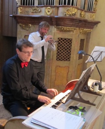 Úvodní Preludium Es dur BWV 552a Johanna Sebastiana Bacha bylo skvělým, po interpretační stránce velmi jasně vystavěným a jistým vstupem do programu večera, který se zpočátku nesl více v barokním duchu. Následovalo Concerto c moll pro trubku a varhany Georga Philippa Telemanna (transkripce Hobojového koncertu TWV 51:c2), v němž se Jaroslav Halíř prezentoval jako zdatný hráč na piccolo trubku; zejména v drobné třetí větě Adagio bylo nutné obdivovat jeho čistý a úžasně jemný zvuk, kterému v závěrečném, virtuózním Allegro nechyběla potřebná lehkost. Wagnerův slavný Sbor poutníků z opery Tanhäuser v parafrázi Ference Liszta byl potom nejen pro ty, kteří znají originál, zajímavým hudebním zážitkem – k varhanní „verzi“ tohoto slavného kusu se podle mě posluchač dostane jen zřídkakdy. Neméně známý Bachův chorál Jesu bleibet meine Freude z kantáty BWV 147 potom navodil v prostorách kostela úžasně klidnou atmosféru. Krásný, sonorní zvuk Halířova nástroje se ve skvělé souhře doslova ladně prolínal s varhanním doprovodem Pavla Černého, který následně přednesl Lisztovo mohutné Preludium a fugu na B-A-C-H. Toto místy až impresionistické dílo, jehož druhou verzi skladatel dokončil v roce 1870, plné technicky velmi obtížných míst Černý zahrál s potřebnou dravostí a technickou jistotou; jeho podání taktéž nechybělo potřebné napětí, které po celou dobu směrem k závěru neustále kulminovalo a dalo krásně vyniknout závěru fugy, v němž se z velkého forte náhle přechází do úplného pianissima.