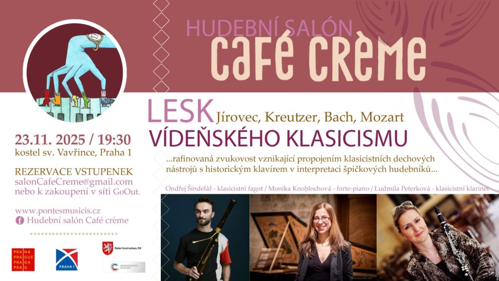 V neděli 23. listopadu 2025 od 19:30 se mohou zájemci vydat do kostela sv. Vavřince vydat za trochu lesku vídeňských salónů přelomu 18. a 19. století. Barevná kombinace klasicistního klarinetu, fagotu a fortepiana zazní v hudbě Jírovce, Kreutzera, C. Ph. E. Bacha a Mozarta v podání Ludmily Peterkové, Ondřeje Šindeláře a Moniky Knoblochové.