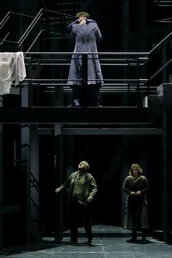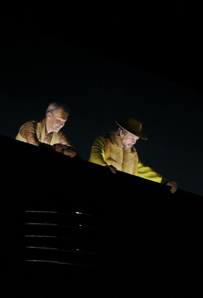 V komplikovanej a technicky náročnej konštrukcii schodiska v podpalubí (scéna Frank Philipp Schlössmann, Matthias Lippert) sa Wagnerovej Tristan a Izolda neúnavne a aj napriek prekážkam pokúšajú nájsť si k sebe cestu. Aj Kurwenal s Brangäne si všimli, že ich panstvo už dávno kašle na spoločenské dekórum a všemožne sa snažia zabrániť im v stretnutí. Kurwenal sklopí schody, Brangäne apeluje na Izoldu. Tam, kde zlyháva človek však, pomôže technika. Izolda sa v nestráženej chvíli dostane na hydraulickú platformu a vyvezie sa k Tristanovi výťahom. Ich objatiam už nemôže nič zabrániť. Nápoj, ktorý má ich city umožniť, nie vyvolať, vylejú obradne cez zábradlie. Neuchopiteľnosť ich citu proti všetkým záväzkom je vyjadrená aj svietením. Decentné šero pretnú až jasne nasvietené posledné takty predohry oznamujúce príchod kráľa Markeho. Brangäne s Kurwenalom sa počas nich previnilo a trochu ustráchane otočia do publika, snažiac sa nájsť ospravedlnenie pre celý malér. Tristan s Izoldou nedbajú na prichádzajúceho kráľa a až do posledného taktu zostávajú v milostnom zovretí.