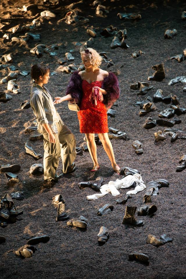Úvodní scéna llie, která je ve vysokém stupni těhotenství (!) s Idamantem, je pojata mnohem dramatičtěji, než obvykle slýcháme, a zaznívá jako skutečný nářek dcery, která ztratila otce a žije ubohým životem rukojmí v nepřátelském prostředí jako dcera nepřítele. Deprivovaná a úzkostná Ilia, oblečená nikoli jako královská dcera Priamova, ale jako poslední služka, během árie nutkavě staví pyramidu z vojenských bot po zabitých vojácích v Tróji, lhostejno zda Trojanů nebo jejich protivníků. Nezralý a labilní Idamante se ji pokouší utěšit, ale sám díky ambivalentnímu vztahu k dominantnímu otci není schopen dostát lidským ani panovnickým požadavkům na nového krále, zvláště po zprávě o smrti otce při mořské bouři. Teprve s příchodem Elettry, dcery Agamemnóna a Klytaimnestry, přichází na jeviště opravdová vládkyně. Elettra je skutečná dcera svých vražedných rodičů, má silný sklon k agresi, a mimoto je to silně narcistní a hysterická osobnost s manipulativními sklony. Módně oblečená Elettra se zcela odlišuje od panující šedi svými barevnými a výstředními kostýmy současné módy a je postavou, kterou si současný divák okamžitě zamiluje. Je to esence Barbie („co potřebuje hodně šatiček“), laciné kopie Marylin Monroe a hlavní hrdinky Sexu ve městě s příměsí kreace Sharon Stone ve druhém dílu Základního instinktu. Elettra bez okolků Idamanta svádí, používá svoje tělo jako nástroj manipulace. Bezmocná a frustrovaná Ilia jen přihlíží a Elettra ji při své árii neváhá tvrdě fyzicky napadnout, aby se zbavila soupeřky, kterou jen pohrdá. Idomeneus, blouznící o právě prožité bouři, je přivezen na kolečkovém nemocničním lůžku záchranáři v oranžových vestách. Ani on není příliš královským majestátem, jde o válečného veterána postiženého posttraumatickým syndromem, kterému se nutkavě vrací bolestivé vzpomínky na válečné utrpení. Idamantes, stále hledající otce, kterého neviděl po deset let trvání Trojské války, nadšeně poznává v zestárlém muži chybějícího otce. Bezradný Idomeneus syna, zřejmě jako i mnohokráte v minulosti, příkře odmítá.