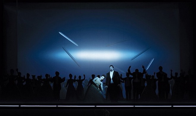 Výborné trio, o němž zřejmě uslyšíme stále více a více, uzavíral otec Giorgio Germont Jihokorejce Seho Changa. Vládne voluminózním, libozvučným, ve všech polohách vyrovnaným barytonem. Při vstupu mne také (jako Alfred) trochu vizáží a parukou překvapil, připadl mi víc jako Pucciniho strýc Bonz z Butterfly, jenž kráčí omylem vyplísnit Violettu. Ale opět rychle jsem zaregistroval jeho kultivovaný projev, plynulé linie Verdiho kantilény se znělými, shora posazovanými výškami. Duet s Violettou byl rozehrán nezvykle do stálého pohybu různých křivek na scéně, jehož aranžmá měli ale pěvci perfektně nazkoušené. Vše je jen nezvyk, nikdy jsem tento krásný dialog rozpracovaný v takové míře pohybu neviděl. Ale měl mnoho do sebe, nervozita, skrývaná Violettou i Germontem, jako by zde byla znázorněna i vizuálně. Pan Wilson je mi sympatický porozuměním pro pěvce a jejich party, staví je permanentně do popředí jeviště, zjevně akcentuje jejich dominanci v příběhu. Ač na tiskovce zamítl jakékoliv historické vazby na Dumase, na dobu románu. Nic takového nebude, pravil, doba je neurčena, vše bude „v esenci prožitku vztahů, které jsou věčné, nemají určenou dobu“. Abstrakce bude dominovat. Ne, nebyla to jen fráze, jak se mi v onen moment jevilo. Ztvárnění dynamickým stálým pohybem spolu se světelnými efekty bylo pro mne, konzervativce, příjemným zážitkem. Jde tu jednoznačně o to, zmocnit se divákových emocí. Litoval jsem, když zazněly poslední tóny opery. Už to znám jako emoční ukazatel. Druhý den se mi vyjevovaly scény z díla docela přesně, od výtvarných obrazů tužek, symbolů asi teprve rozepsaného příběhu, přes obrazce ostnatých drátů, měnících stále své geometrické tvary, zvýrazněných to emocí druhého obrazu s jeho proměnami ve vývoji děje. Až po ono okénko do nebes v závěru, které stoupá vzhůru, až zmizí. Scéna minimalisticky laděná zaujme světelnými adoracemi. Vždy, když je výrazový zlom, scéna zasvítí v oslnivé záři, jakož se i v intenzitě mění síla neonových zářivek, zavěšených nad orchestřištěm. Exaktně a smysluplně podle výrazu hudby a zpívaných textů.Jeden silný prožitek za všechny. Germontův slavný evegreen v Andante – Di Provenze il mar, il suol chi dal corti cancellò? – zpívaný střídavě forte, mezza voce, piano, dojde k finálnímu, de facto úpěnlivě prosebnému vysokému Ges otce, prosícího syna o jeho návrat domů. Celá scéna, vše, co je světelně v dosahu, se prudce rozsvítí jako symbol nezměrných emocí otce k synovi. Dojem je ohromný, to přiznám, ač bych myslel, že pěvcův vnitřně přesvědčivý výraz musí stačit. Ne, tenhle světelný „blesk z čistého nebe“ spolu s výrazem fráze Seho Changa mám v sobě jako emotivní úder i nyní, kdy den poté píši tyto řádky. Rovněž rozvržení díla režisérem je vhodné. Jako prolog děje, proto pauza je již po prvém dějství, aby poté intimní příběh spojila do jednoho celku šedesáti minut. Hlavní přestávka následuje až před epilogem, tedy čtvrtým obrazem.