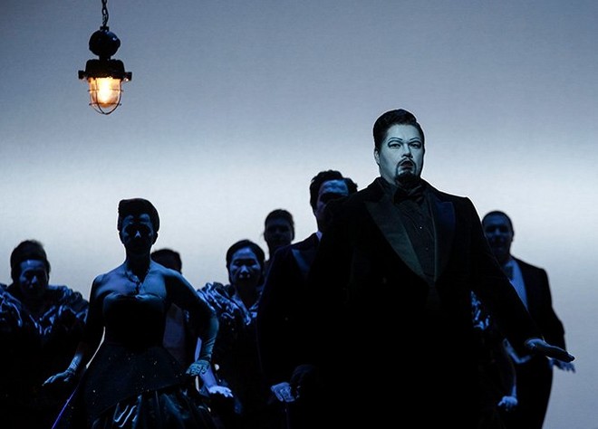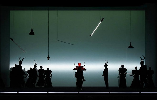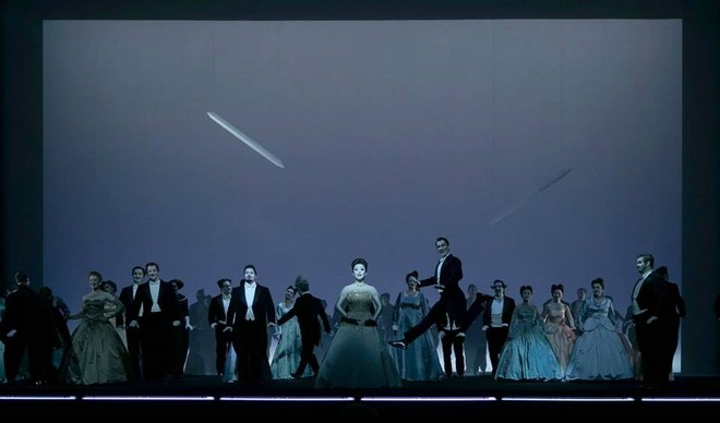 Úmyslně jsem nezačal psát o režii samostatně, ale právě ve spojitosti s pěveckými výkony, neboť je doslova provázána se zajímavou specifikou hereckých výkonů pěvců. Nelze proto jejich výkony rozebrat bez poukazu na specifický pohybový režim, který zaujme, neb je výrazově k věci! Což mám za podstatné v jakékoliv režii. Ať už se nazývá jakkoliv. Režisér vytváří pohybové a gestické obrazce herců, ale dle jejich dispozic, je zřetelné, že se nikdo do ničeho nenutí, ba spíše naopak. Jeho idea tance a stálého pohybu byla více soustředěna na druhooborové postavy opery, na sbor či spíše jeho některé členy, ne na všechny. Cupkání Anniny (Kerstin Eder) drobňoučkými krůčky po jevišti ve vážných momentech děje sice vzbuzovalo v hledišti hlasitý smích, podobně jako trochu neurotické kývání hlavou do stran v rytmu hudby u Gastona (jevištně velmi tvárný Matthäus Schmidlechner). Obdobně pohyby členů sboru, výrazné grimasy Flory Bervoix (Katrin Handsaker) či barona Douphola (pěvecky znamenitě disponovaný Martin Achrainer).Naopak důstojný klid a rozvážné pohyby doktora Grenvila (přesvědčivě pěvecky i jevištně působící Dominik Nekel). Kdyby ovšem tento typ pohybovosti byl realizován v hudebně a pěvecky průměrné inscenaci, možná bych tyto quasi humorné efekty bral jinak, neboť pro mne právě zde k věci nejdou. Ale v inscenaci s výborným hudebním provedením, s výkony mladých pěvců v jejich optimálním času kariéry, je pro mne základ režie pana Wilsona z pohledu celku zdařilý. Výkony umocňují ve výrazu dynamiku, když jakákoliv statičnost je nemilosrdně odhozena coby nepotřebná veteš nudy. Práce se světly působí smysluplně, neboť ta je cele ve službách díla (světelný design byl v rukou Johna Torrese). Leckteré piruety sboristů a menších postav opery, na solidní pěvecké úrovni předvedených, byly ovšem z oné druhé strany pohledu nadbytečné, trochu samoúčelné. Což právě k věci zase tak moc není. Jen jakési zpestření celku. Ale ani na minutu se patrně nikoho nezmocnil pocit nudy. A jeho veličenstvo divák, jak známo, promine leccos, jen nudu nepromine nikdy. Humor je nejdůstojnější vyjádření smutku. Tento bonmot herce Miloše Kopeckého by mohl platit i pro pojetí humoru pana režiséra Wilsona, který jím prošpikoval Dumasovo drama o nekonečné lásce. Ale vždyť sám vlastně řekl, že mu nejde o historizující estetiku pro dnešek – „keine festlegende Deutung ist das Ziel“ („žádný pevně stanovený výklad není cílem“), nýbrž možná mnohost asociací přípustných v času – prostoru – konstrukci, kde sugestivní sílu Verdiho hudby lze tímto způsobem vyprávět. Ano, lze. Celek působil přesvědčivým dojmem.