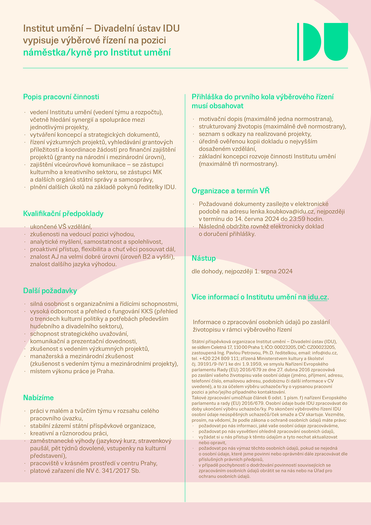 Institut umění – Divadelní ústav IDU vypisuje výběrové řízení na náměstka