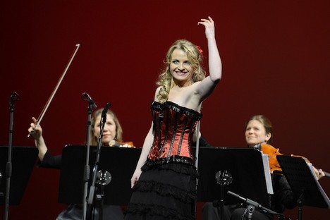Ako prvý blok, v ktorom Jana Kurucova „vyskloňovala“ dominantnú tému večera, boli Mozartove podoby ľúbostných citov. Roztúžený a emóciami zmietaný Cherubino z Figarovej svadby vtrhol na javisko v chlapčenskom oblečení s obrovskou kyticou ruží (tie postupne končili medzi divákmi) aby ukázal, že aj takouto krátkou „nohavičkovou“ áriou je možné naviesť situačnú ilúziu. Po malej úprave kostýmu sa z rozšanteného chalana stala prešibaná, trocha naivná, trocha vypočítavá Zerlina (Don Giovanni), aby vzápätí sólistka preladila na strunu podvedenej manželky Dona Giovanniho (ária Donny Elviry „Ah, fuggi il traditor“), varujúcej práve Zerlinu pred zvodcom. Obe postavy z Mozartovej „opery opier“ sa zavše zverujú vyšším mezzosopránom, takže ich tónový rozsah nerobil žiaden problém ani Jane Kurucovej. Dokázala, že je v mozartovskom slohu zorientovaná, má potrebnú kultúru frázovania, tieňovania farieb a dynamiky.Dve belcantové zastávky tvorili ukážky z u nás neprávom zaznávaných vážnych opier Gioachina Rossiniho a Gaetana Donizettiho. Výnimkou je práve Lucrezia Borgia, ktorá má za sebou krátky javiskový život na scéne Opery SND (2007-2010), ako aj skvelé koncertné uvedenie s Editou Gruberovou a Pavlom Bršlíkom v rámci Bratislavských hudobných slávností 2011. Z nej zaspievala Jana Kurucová áriu Maffia Orsiniho „Il segreto per esser felici“ s náležitým temperamentom a príjemne sfarbeným, pohyblivým materiálom. Prekrásny vstupný recitatív a ária titulnej postavy Rossiniho opery Tancredi („Oh patria! – Di tanti palpiti“) býva vizitkou technickej virtuozity a slohovej zdatnosti rossiniovských mezzo-koloratúr. Podmanivo impresionistický orchestrálny úvod síce komorná úprava trocha rozmazala, zato Kurucovej podanie nieslo podstatnú časť známok medzinárodne akceptovateľnej rossiniovskej interpretácie. Isteže, Kurucova nemá kontraaltovú farbu a dramatický náboj takej Ewy Podlešovej, nebohej Lucie Valentini Terrani či Daniely Barcellony, azda jej ešte chýba aj kúsok rafinovanej virtuozity a technického exhibicionizmu, (Rossini ho má v prvom pláne), rozhodne však bol to v emóciách a štýle čistý Tancredi, akého by sme na našich javiskách brali všetkými desiatimi.