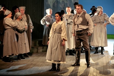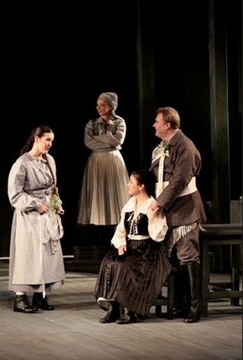 Aká teda je nová bratislavská inscenácia? Zrejme rozdielne ju bude vnímať „panenský“ divák, inak rozhľadenejší a inak ten, kto bol svedkom ostatnej košickej premiéry. Najmä v porovnaní s ňou sú diferencie dosť zreteľné. A to aj napriek tomu, že rovnako Martin Otava ako aj Michael Tarant nefandia experimentom, posunom, či módnym výstrelkom. Zjednodušene povedané, obaja sú pokorní, tradiční. Sú však iní vo viacerých rovinách. Tarant mal výhodu v samotnom divadelnom priestore. Košické javisko svojou intímnosťou príbehu nahráva, v podstate komornú drámu doň možno ľahko skoncentrovať. Nové bratislavské má značnú šírku a tá do istej miery koncepciu zradila aj zranila. Dianie je na šedo kolorovanej, popisných barličiek zbavenej scéne Jána Zavarského rozptýlené, protagonisti sa v anonymnom priestore (mimo masových scén) zavše strácajú, zbytočne po ňom premávajú.Téma folklóru, jeho priznanie alebo potlačenie, je aktuálnou dilemou dnešnej inscenačnej praxe. Aj v nej sa Otava a Tarant rôznia. Zámerom Otavu bolo ho čo najviac eliminovať a neutralizovať, a to aj pomocou utlmujúcej farebnej štylizácie kostýmov Petra Čaneckého. Naopak, Tarant sa ľudovosti nebojí. Vníma ho ako znak funkčného kontrastu, kroj ukáže a ani stopa po gýčovosti sa neobjaví. V inom je však zasa Otava vecnejší a priamočiarejší, na rozdiel od Tarantovej obľube v „ilustrovaní“. Predsa však je opatrnícky. Keď už nechce ornamenty ľudovosti, tak načo kostýmy štylizovať a neposunúť ich hneď do prítomnosti. Hoci hádam ani z nej kroje celkom nevymizli. (To je skôr akademická otázka, keďže súčasné zvyky z „venkovského života moravského“ naživo nepoznám.)