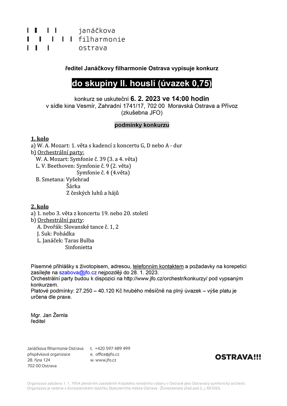 Čtení Janáčkova filharmonie Ostrava vypisuje konkurz do skupiny II. houslí