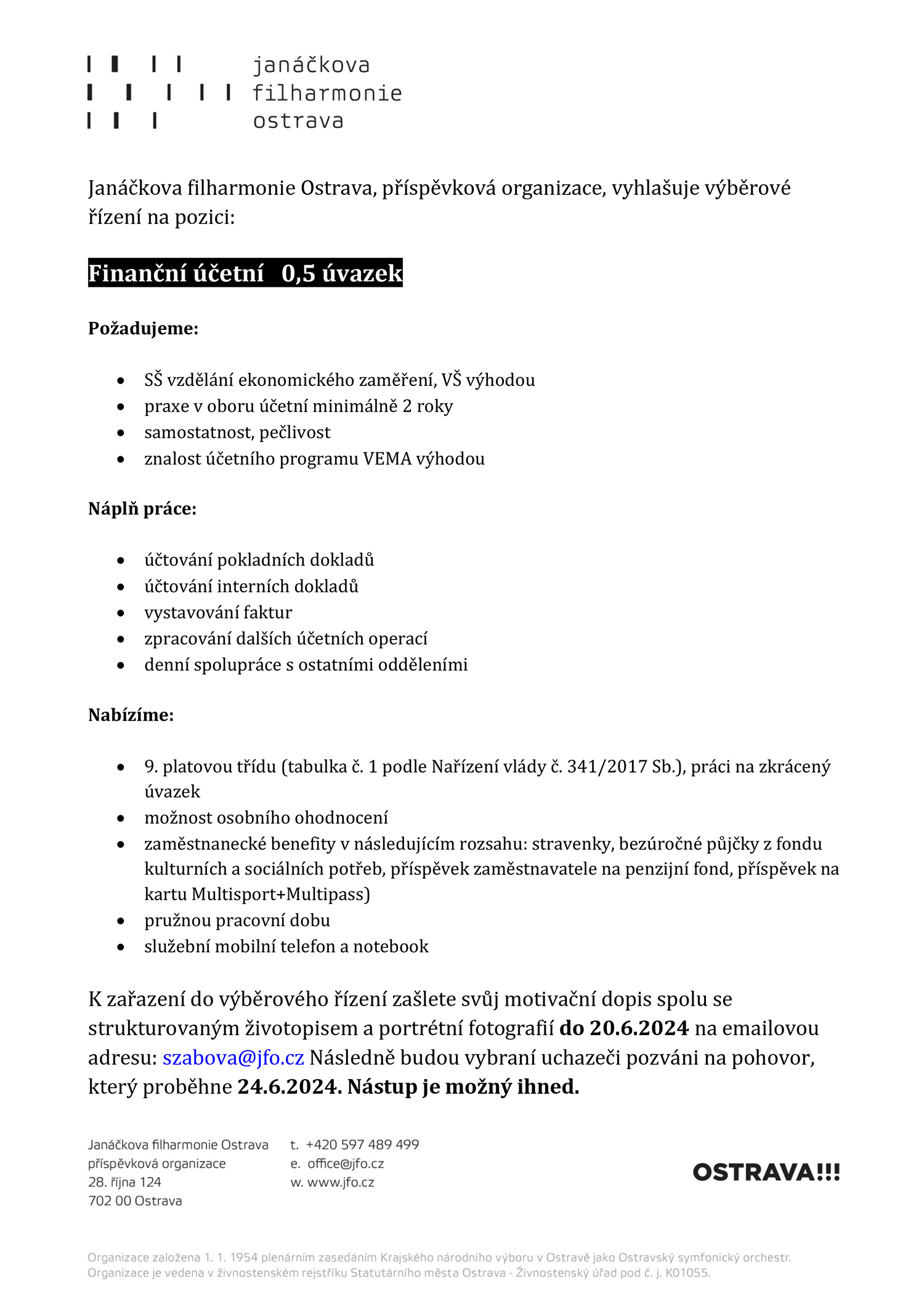 Janáčkova filharmonie vyhlašuje výběrové řízení na pozici: finanční účetní
