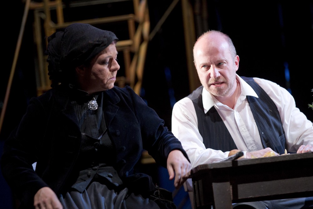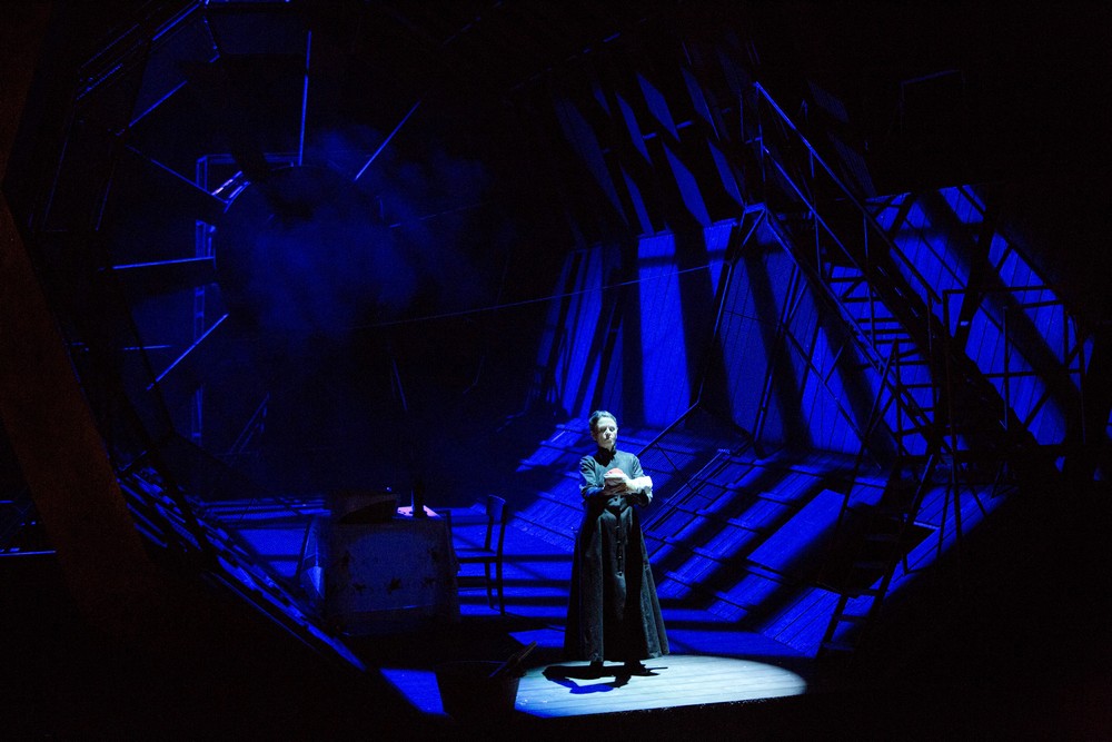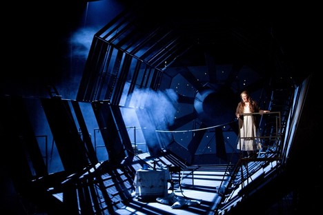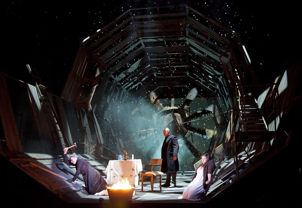 Režisérovu záměru odpovídala scéna a kostýmy šéfa výpravy v nejsevernější německé scéně ve Flensburku, Martina Fischera. Je to v podstatě veliká dřevěná konstrukce, připomínající dozadu se zvedající tunel s velikým ventilátorem v pozadí. Onen jakoby válec je pobitý dřevěnými prkny s většími nebo menšími mezerami a vedou do něj různé vchody. Jeho vnitřek bývá podle dramatických událostí na scéně zajímavě nasvícen. Je to jakýsi symbolický mlýn času a osudu. Rychlost otáčení lamel se opět liší dle dramatičnosti dějových expresí.