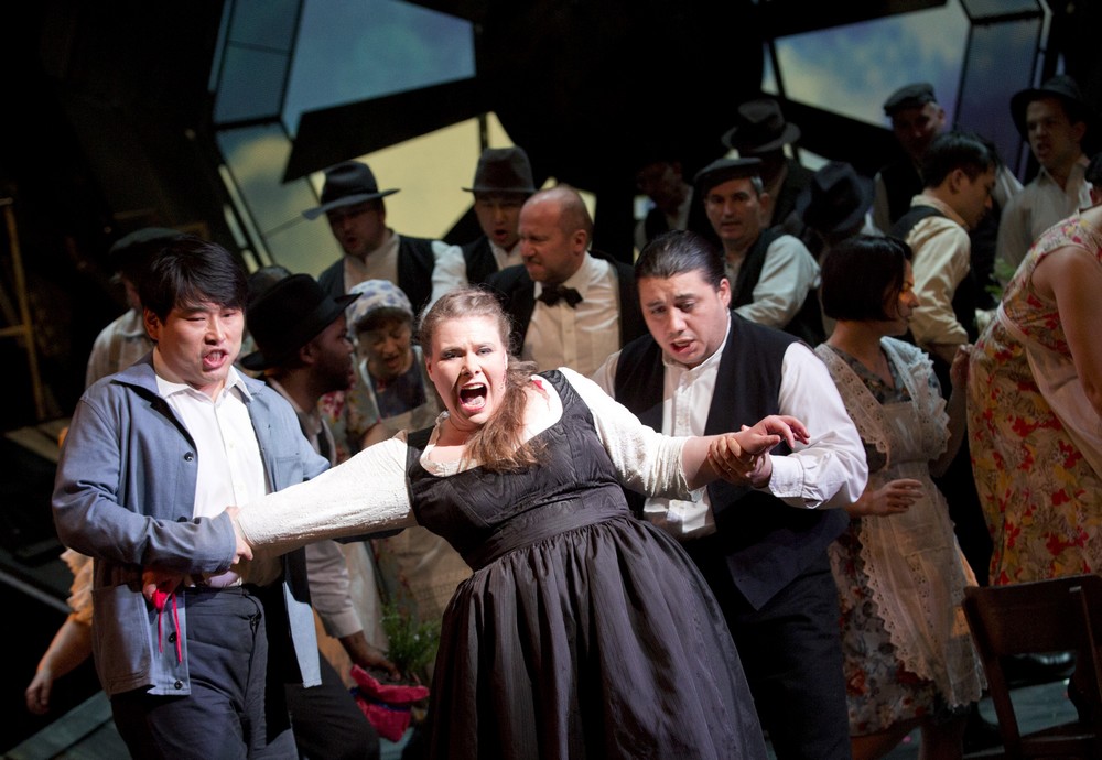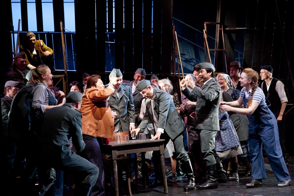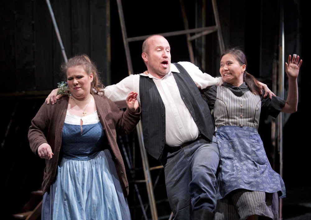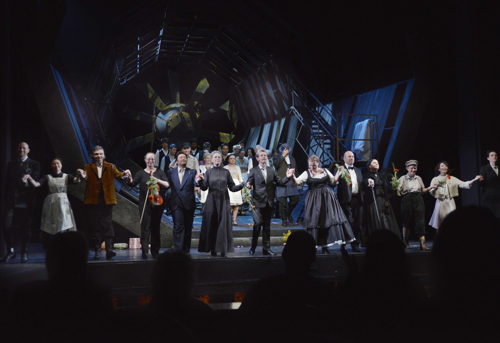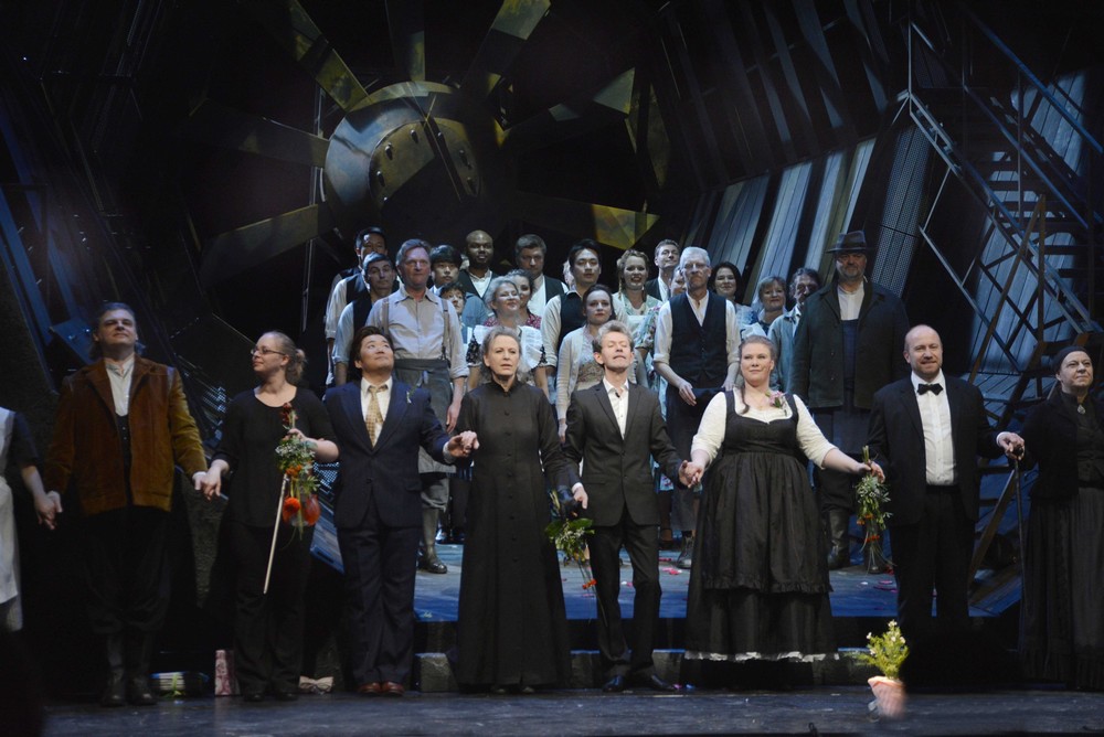 Po dosti dlouhé pauze se otevírá opona a vidíme v podstatě stejnou dekoraci, jen v popředí je prostřený stůl a vzadu další menší stůl s kupou dárků k Jenůfčině svatbě. Mezi svatebními hosty se nám představí mimo jiné velmi pěkně zpívající Karolka v podání mladé Japonky Akiho Tsujii. Rychtáře zpíval Kai Wefer a jeho ženu Eleonora Wacchi z Thüringenského operního studia. Kostelnička se nedlouho před tím, než je objevena mrtvolka děťátka, nervózně zakrývá bílou peřinou. V závěru se pak také objevuje uprostřed mezi komparsem malá bílá rakvička. O něco více než dvacetičlenný sbor, který na menší ploše jeviště a složité dekoraci vypadal početnější, nastudoval Holger Krause. Divadlo sice nebylo zcela naplněno, ale opon po konci bylo nepočítaně a aplaus, nadšené výkřiky a dupání byly tak silné, že jsem si připadal jako někde v Itálii v plném sále po premiéře. Síla Janáčkovy hudby je prostě obrovská.+++