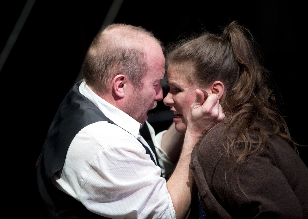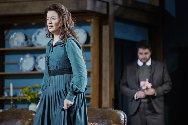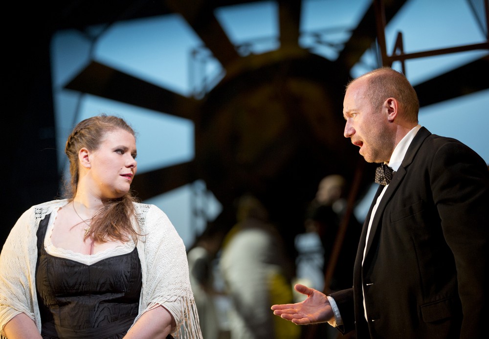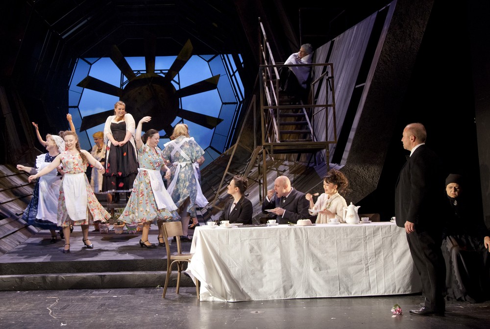 Pár slov k detailu, který není obvyklý. Laca zpívá „Kostelničko, upadl vám šátek…“, zdvíhá jej a podává. Zde však Kostelničce upadne rukavice. V nadcházejícím druhém dějství se scéna otočí a dostáváme se do interiéru prostorné dekorace. Teď jednoznačně dominuje pěvecky i výrazově Béela Müller jako Kostelnička a Jenůfka Anne Preuss velmi procítěně zpívá motlitbu k panence Marii za doprovodu houslistky, která hraje výborně vedle ní na jevišti. A opět jedna zvláštnůstka, které jsem nerozuměl: ve zpěvu Jenůfky a i v německých titulcích nad portálem se najednou poprvé objevuje jediné přejaté české slovo mamička (s dobře vyslovenou hláskou č). Sugestivně pak působí závěr dějství, kdy se Jenůfa smiřuje se ztrátou děťátka a souhlasí se sňatkem s Lacou. Vezme kovovou nádobu na praní, dává do ní prádlo svého zemřelého robátka a zapaluje je. Tím končí jedna smutná kapitola jejího života.