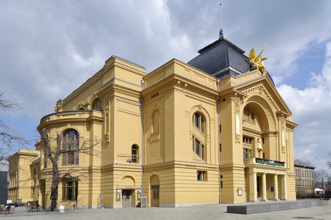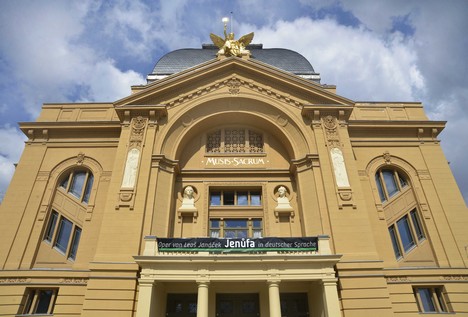 Sluncem pěkně nasvětlená a fotogenickými mraky orámovaná klasicistní budova divadla vítala nedělní odpolední návštěvníky velkým transparentem s nápisem „Oper von Leoš Janáček Jenůfa in deutscher Sprache“, který visel nad hlavním vchodem.