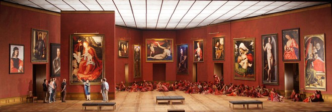 Prostor obrazárny se stále proměňuje – renesanční plátna pojíždějí po místnostech. Hudbu totiž významově doprovázejí rozličná plátna, například téma madony s dítětem při árii Azuceny (vynikající Ekaterina Semenchuk) o její osudové ztrátě z druhého jednání, rytíři na koních při konfliktu Manrica a Luny, téma lásky dolaďují podobizny krásných žen ze slavných obrazů, například da Vinciho Dáma s hranostajem nebo Botticelliho Venuše.