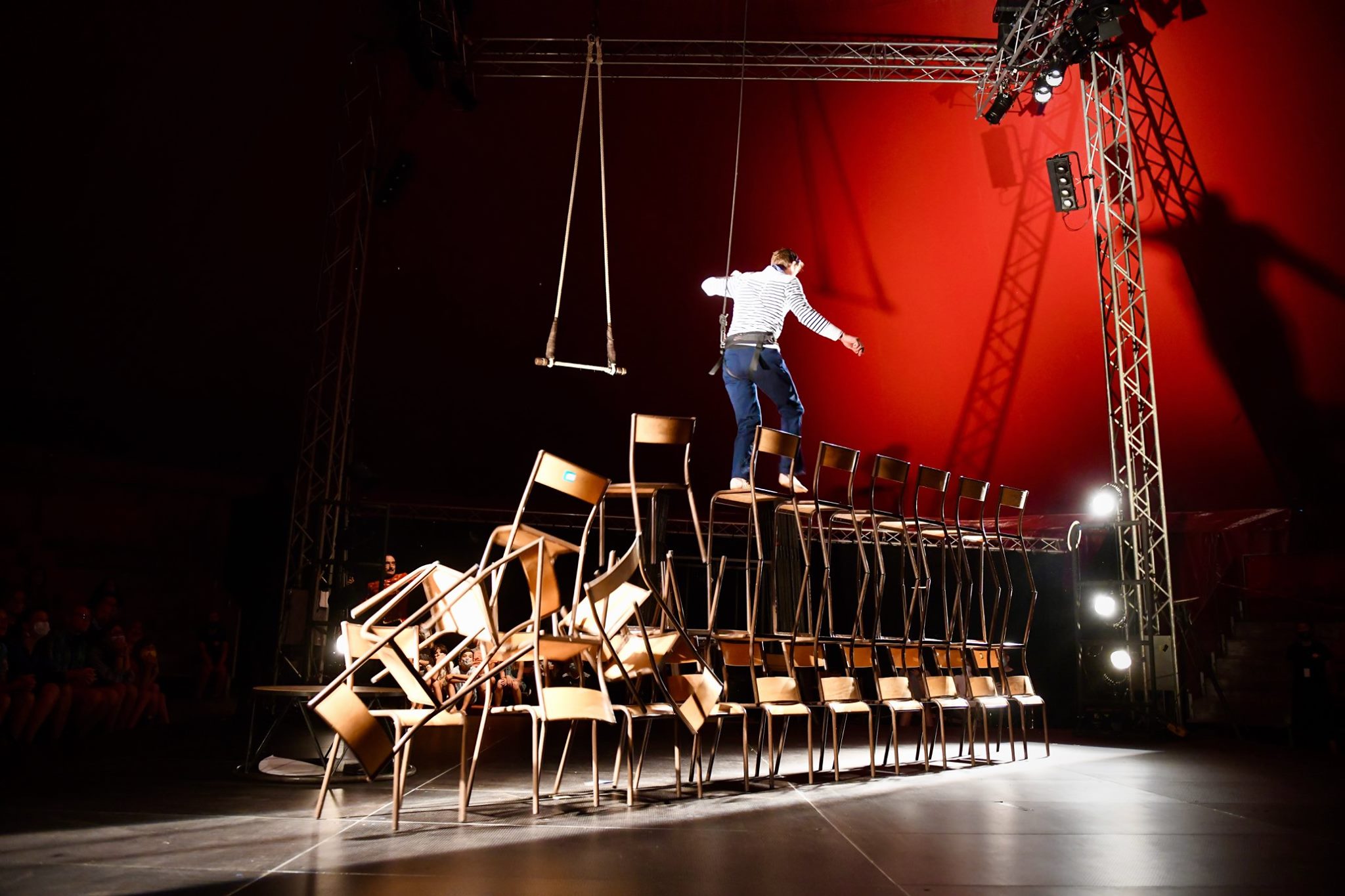 Už při vstupu do šapitó upoutala pozornost v manéži stojící třípatrová konstrukce z židlí – dlouhá promenáda, kdy na spodní židli stála nohama obrácenýma nahoru druhá židle a na jejích čtyřech nohách byla postavena třetí. A takto stálo vedle sebe deset sloupců vždy po třech židlích. Na tuto hromadu vyšplhal v úvodu Lucho Smit (jištěný na laně a sedáku) a elegantně po vratké stezce přeběhl za hřmotného zvuku padajících stoliček. Až v závěru pochopíme, že to byla prolepse, pohled do budoucna na to, co nás ještě čeká, a tedy vrcholné závěrečné číslo na vratké věži ze židlí.
